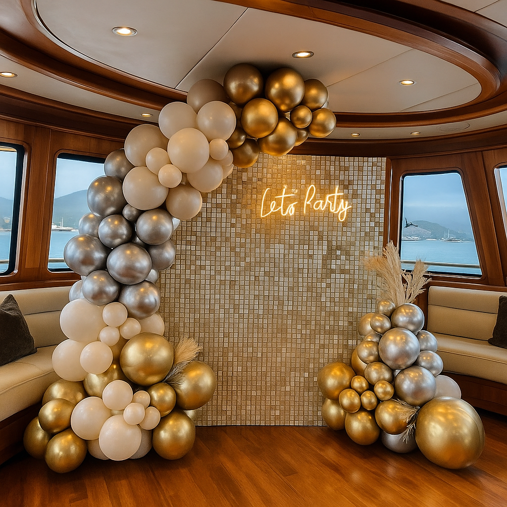 Gold & Silver Birthday Balloon Backdrop for Yacht Decor
