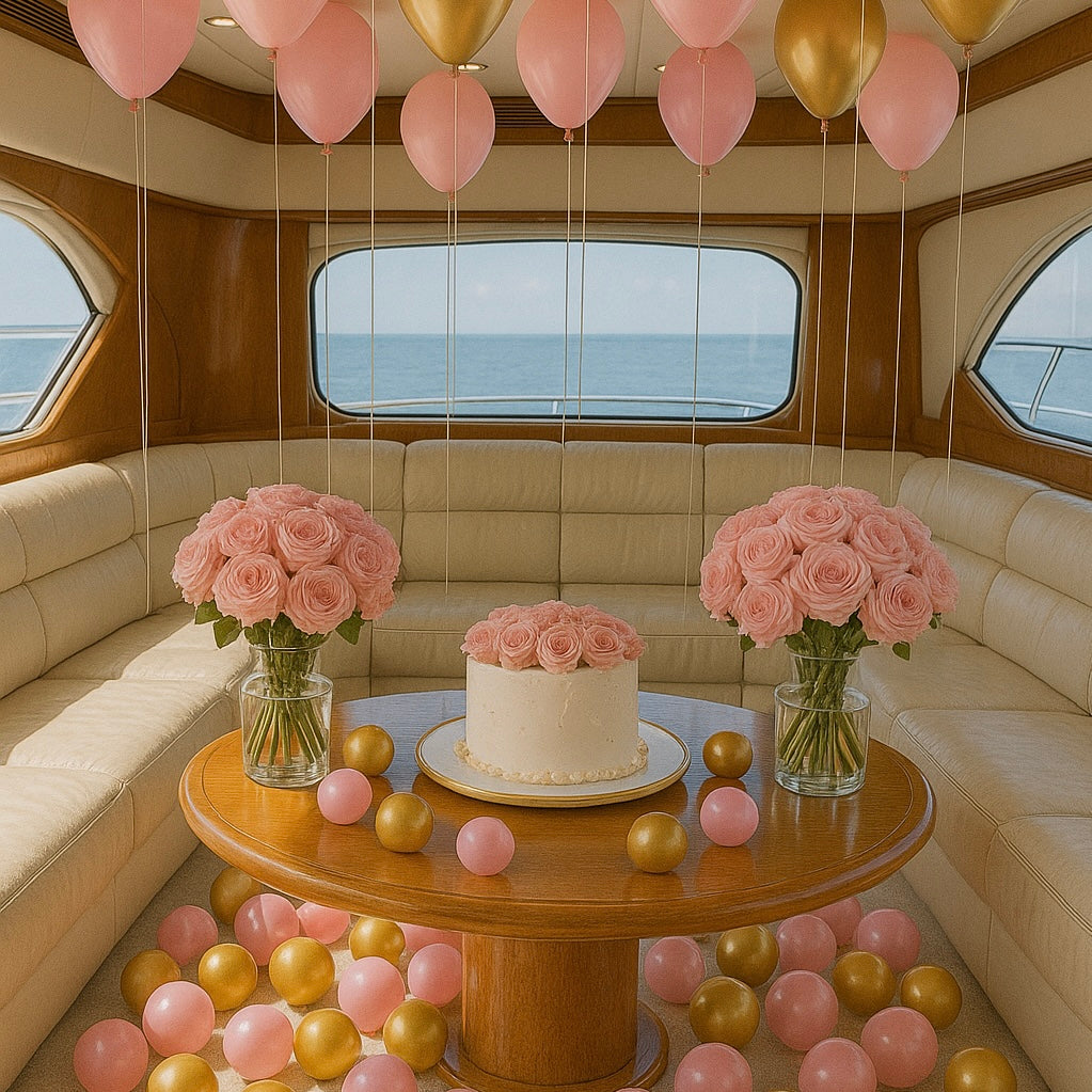Pink & Gold Balloons, Cake & Flower Decoration for Yacht