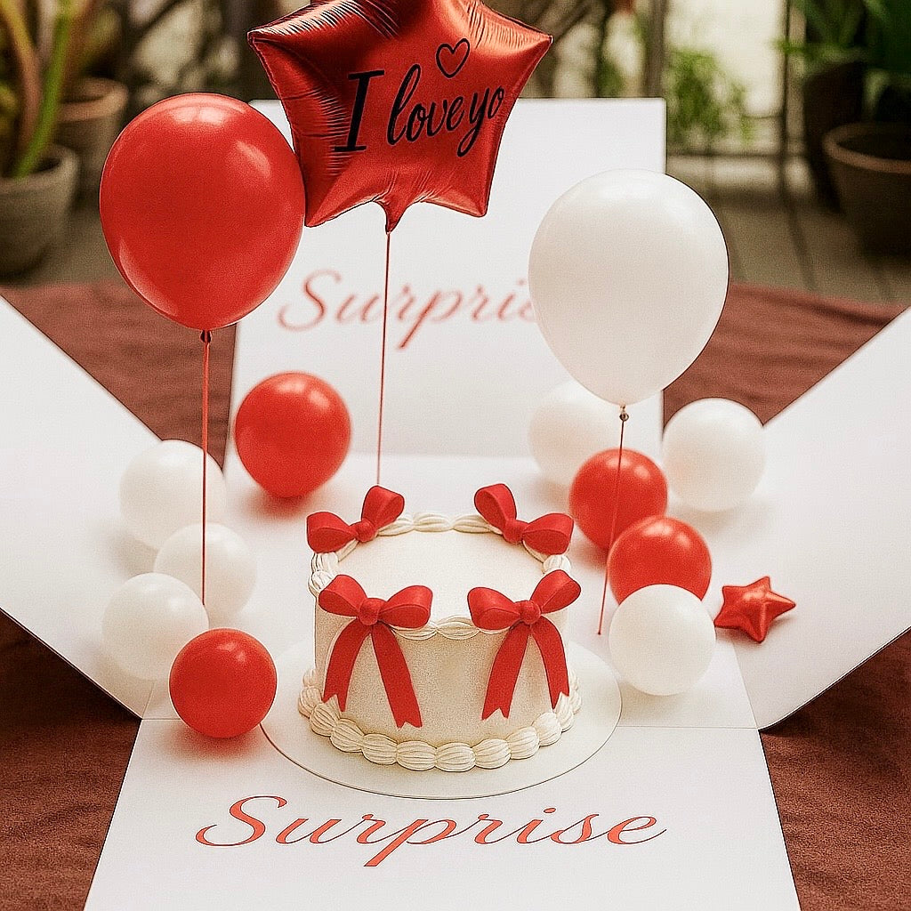 Red & White Surprise Balloon Box with Birthday cake