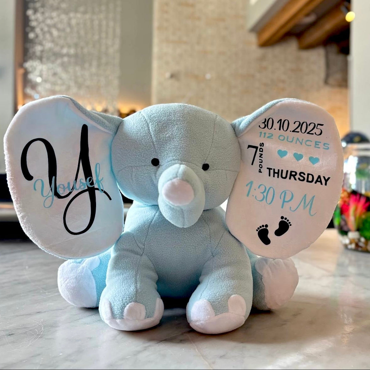 A Blue elephant plush with white inside the ears and white toes. Measures 13 inch sitting and personalised in elegant black & blue text! A keepsake special gift which is for sure unique and will always be remembered!