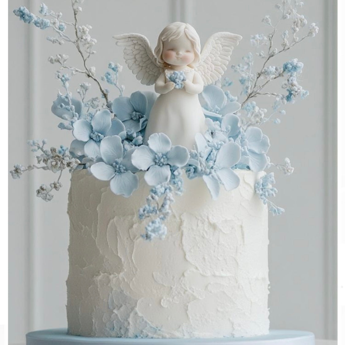 Decorate & complete your venue decoration with this elegant angel & flowers themed cake! Made with Swiss chocolate and premium ingredients, This alluring cake is composed out of a sponge base & cream fillings of your choice. Perfect for new born, baptism or first communion.