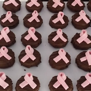 Mark Breast Cancer Awareness month with something sweet for your guests. Crunchy Oreo cookies are dipped in chocolate and feature a pink ribbon on the cookie.
