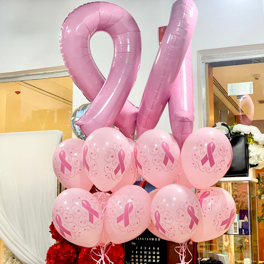 Show support for Breast Cancer Awareness month with this charming balloon bouquet. Featuring 6 pink helium inflated latex balloons with a pink ribbon on them, and a foil balloon in the shape of the Pink Ribbon. Comes attached with curled ribbon and elegant balloon weight.