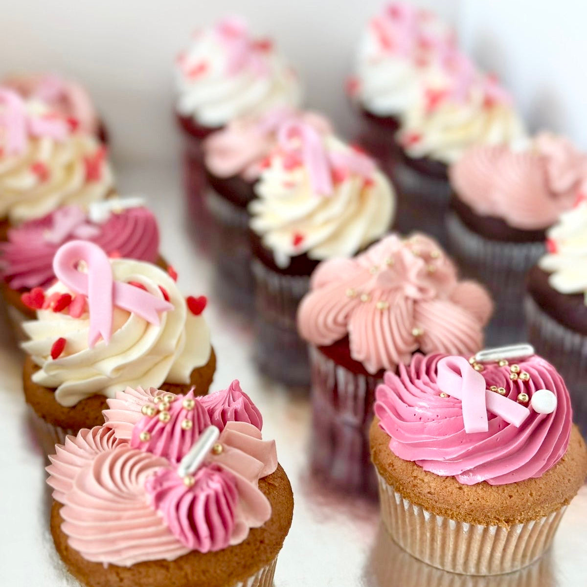 Mark Breast Cancer Awareness month with something sweet! Delectable cupcakes in flavors of either chocolate, vanilla or red velvet is topped with a tasty frosting and is decorated with pink ribbon icing.