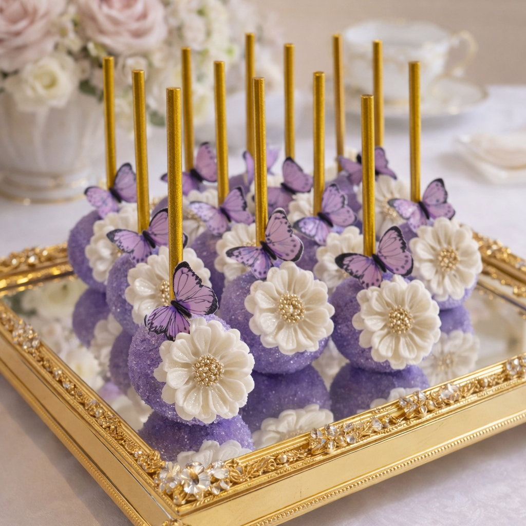 Brighten their day with these sweet treats! These purple cakepops are dipped with Swiss chocolates and decorated with white flower & butterfly . Perfect for party table setup and gifting loved ones on their birthday, or special occasion.