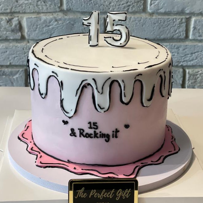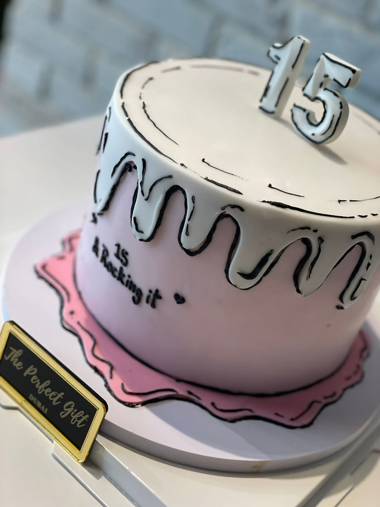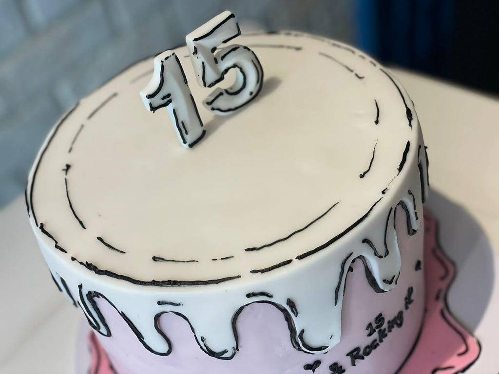 Delight their eyes and taste buds with this fun cartoon cake! This gorgeous cake features pink icing with dripped white on edges with a sponge cake in either vanilla, chocolate or red velvet (you choose the flavor and the filling!)