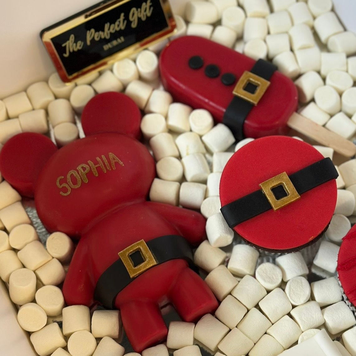 Surprise your loved ones with this Christmas gift and let them smash the chocolate teddy and indulge on the cake filled inside! A New and Trendy gift; choco-smash cake made from Swiss chocolate in shape of red teddy bear and filled with cake inside - decorated with Santa's belt! Also included 2 cupcakes, and one cakesicle and white marshmallows.