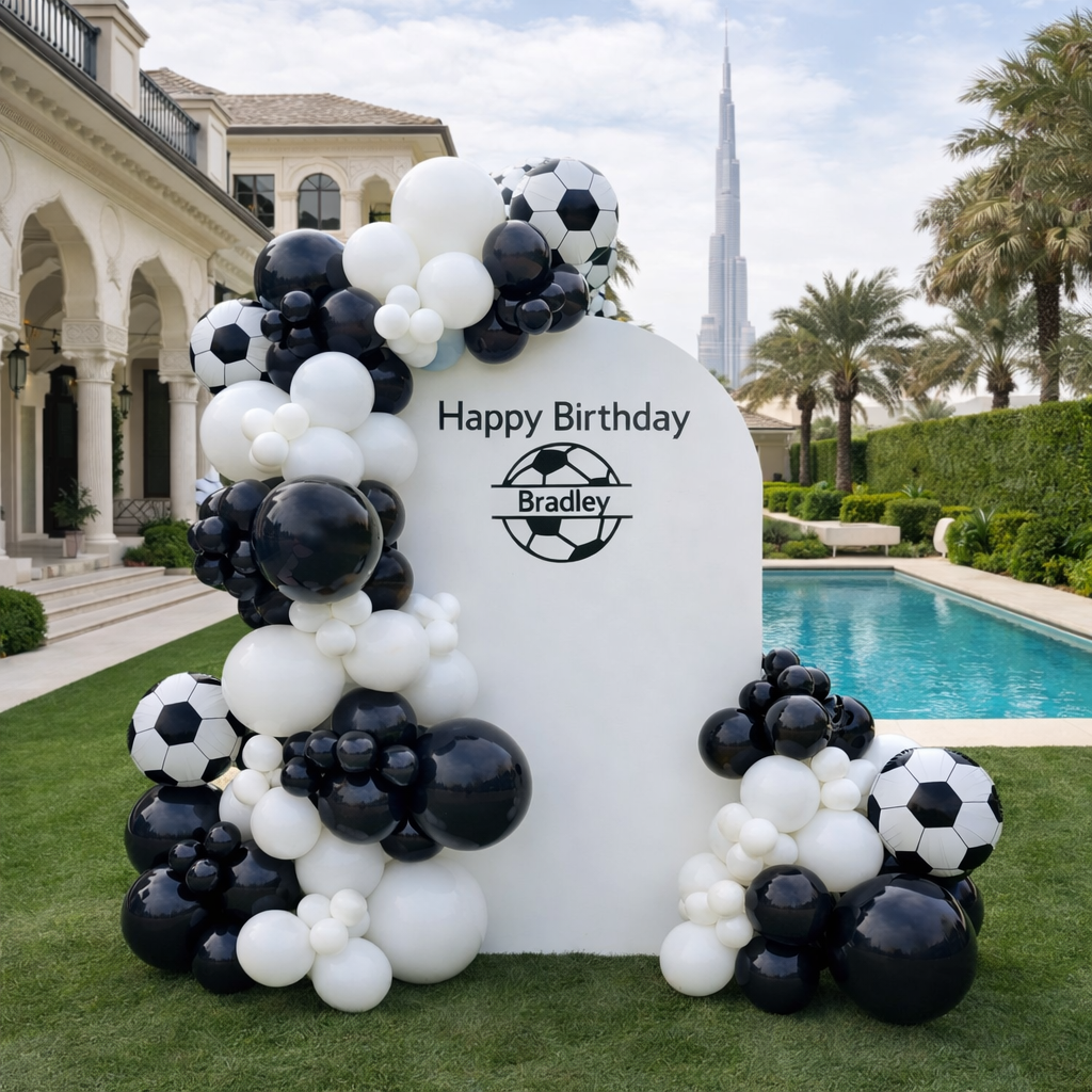 Surprise him on his birthday with this football / soccer Theme balloon backdrop! Featuring football latex balloons and white & black latex, and personalised text on board.