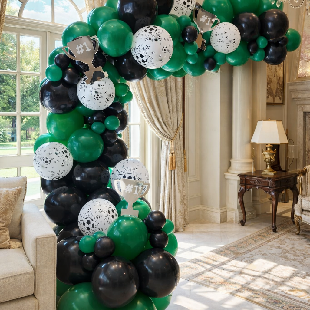 Surprise him on his birthday with this football / socer Theme balloon garland! Featuring football latex balloons and green & black latex, and silver trophy on balloon.