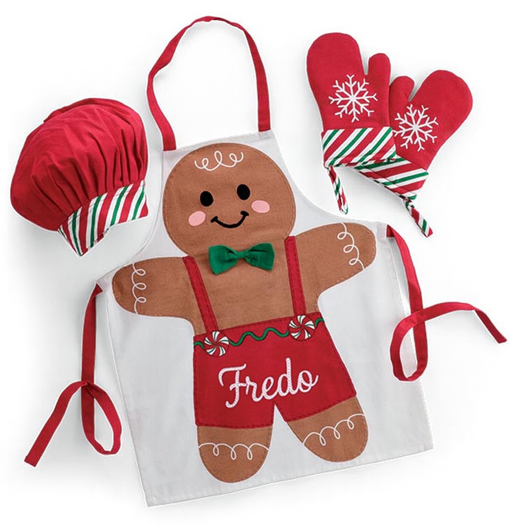 White apron with large Gingerbread man on the front, with green and red accents. Red chef's hat with red, white, and green striped cuff, red oven mitts with striped cuffs, and a white snowflake printed on the top.