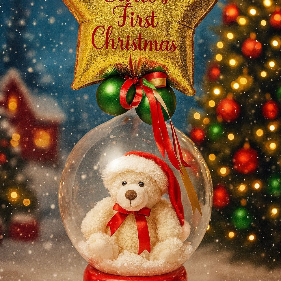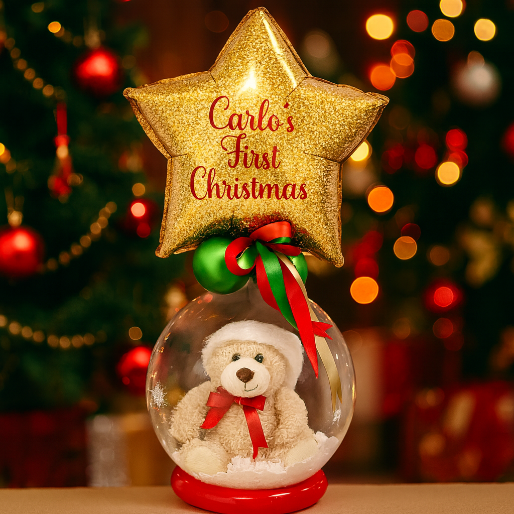 Wish your loved ones Merry Christmas with this personalized bubbe balloon, featuring an adorable teddy bear with santa hat and red,gold and green balloons with snow flakes topped up with a star and a message of your choice!