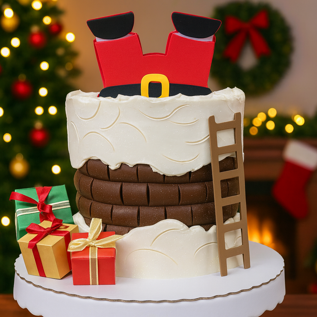 This Christmas, surprise loved ones with this delightfully charming Christmas Cake! This cake depicts Santa attempting to make his way through a chimney. The cake is created out of a sponge cake, and decorated with frosting.