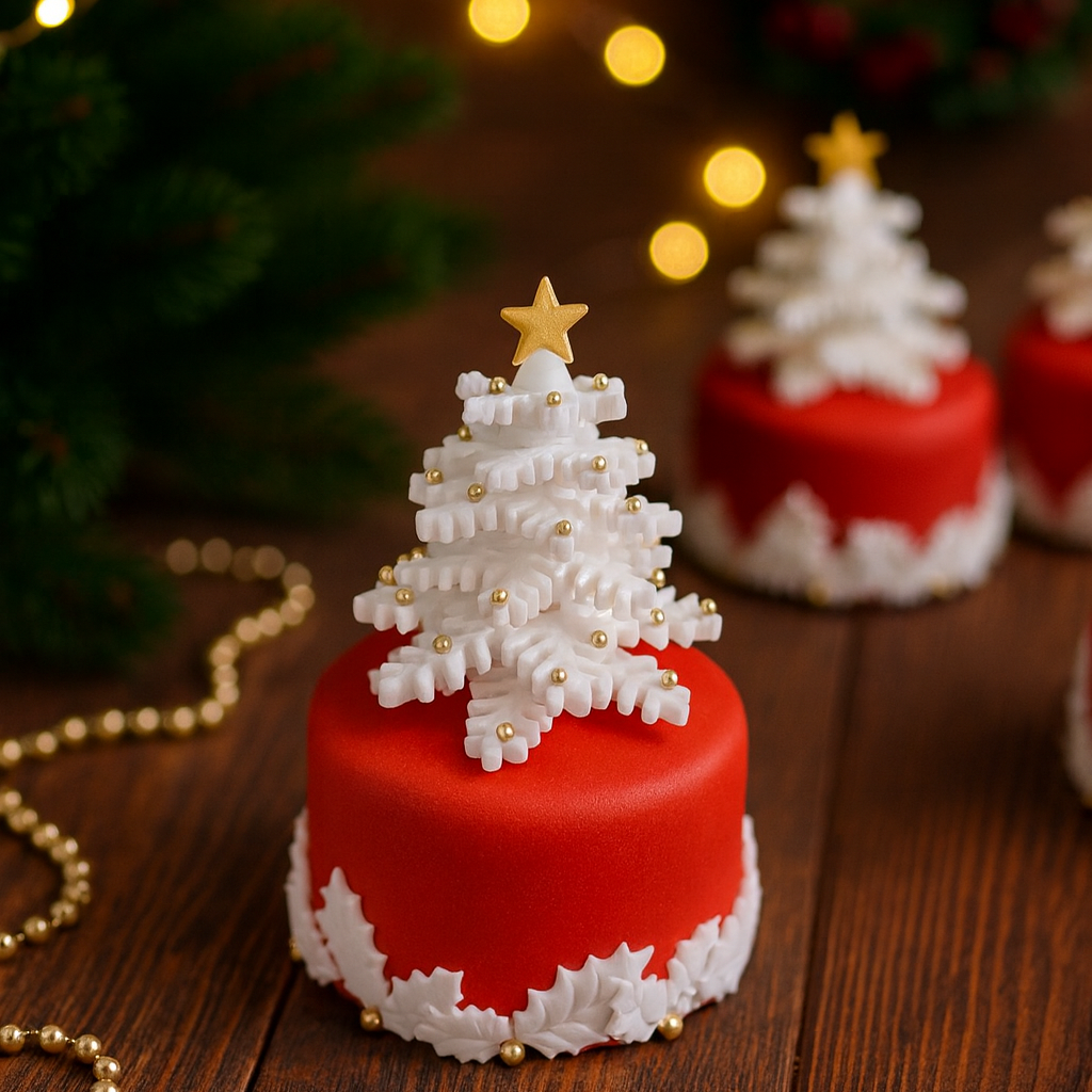 This Christmas, surprise loved ones with a sweet treat! Featuring festive cupcakes to celebrate this holiday season, with white Christmas trees on a mini cake covered with red sugar paste and decorated with white Christmas leaves.