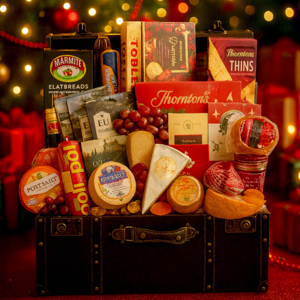 Surprise them on their special occasion with this delicious gift hamper featuring a leatherette suitcase filled with an assortment of delectable, savory and HALAL cheese treats perfect for this winter season. Also included;