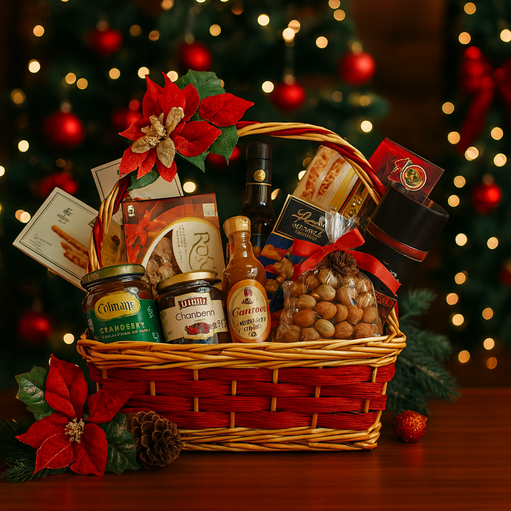 Send your love to friends, family and loved ones this festive season with a rustic wicker gift basket, stuffed with goodies such as: