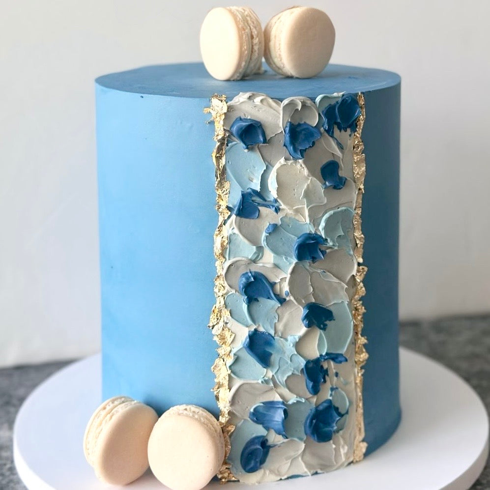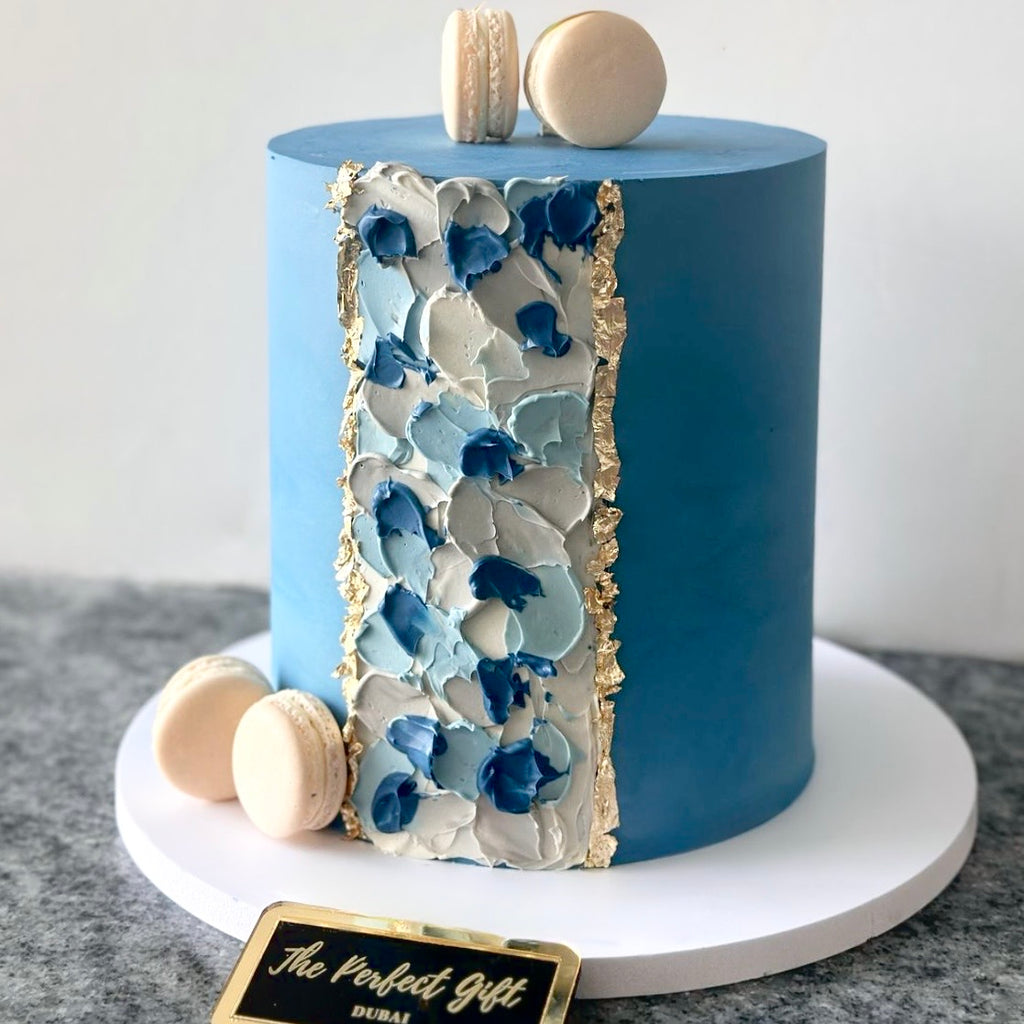 An Elegant blue cake with gold centre with brushed of grey & shades of blue design, macarons! & topped with acrylic topper All our cakes are made from premium ingredients from Europe and Swiss chocolate making it light in texture yet full of flavor!