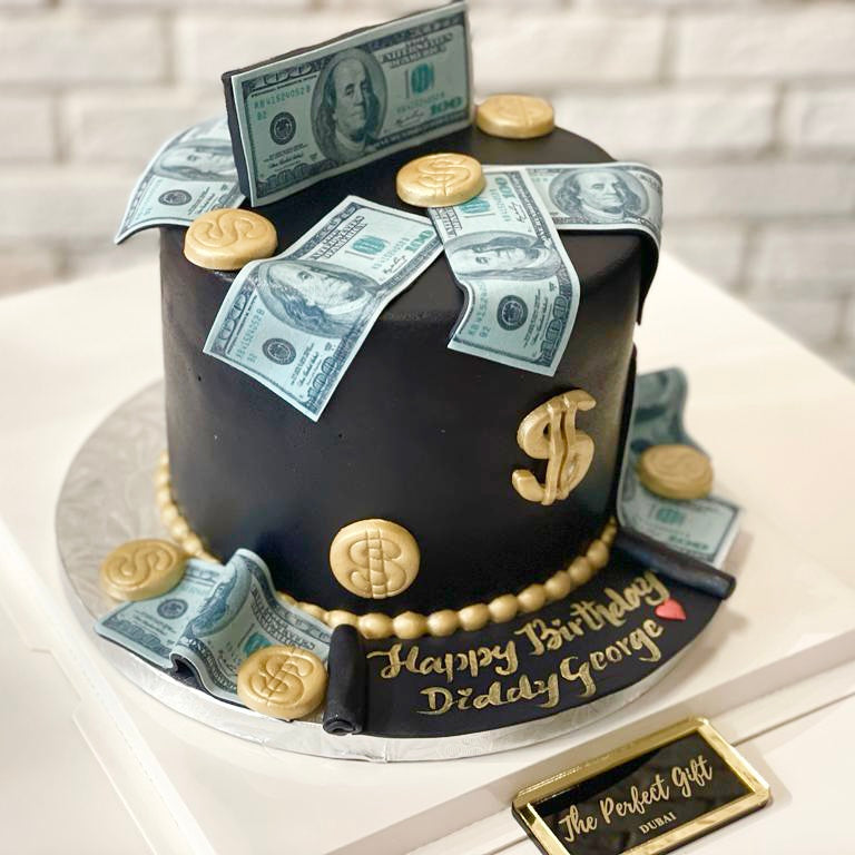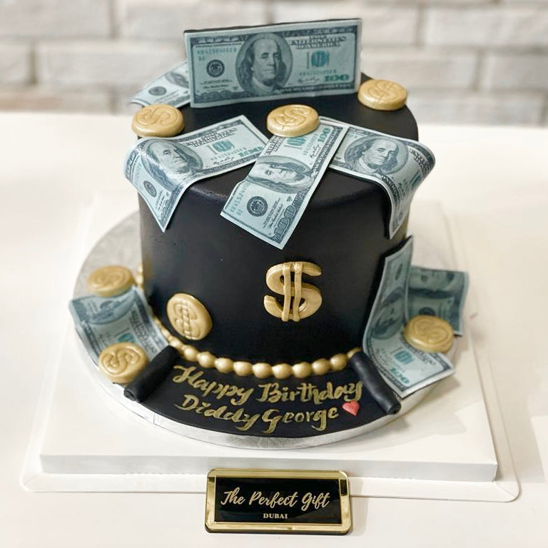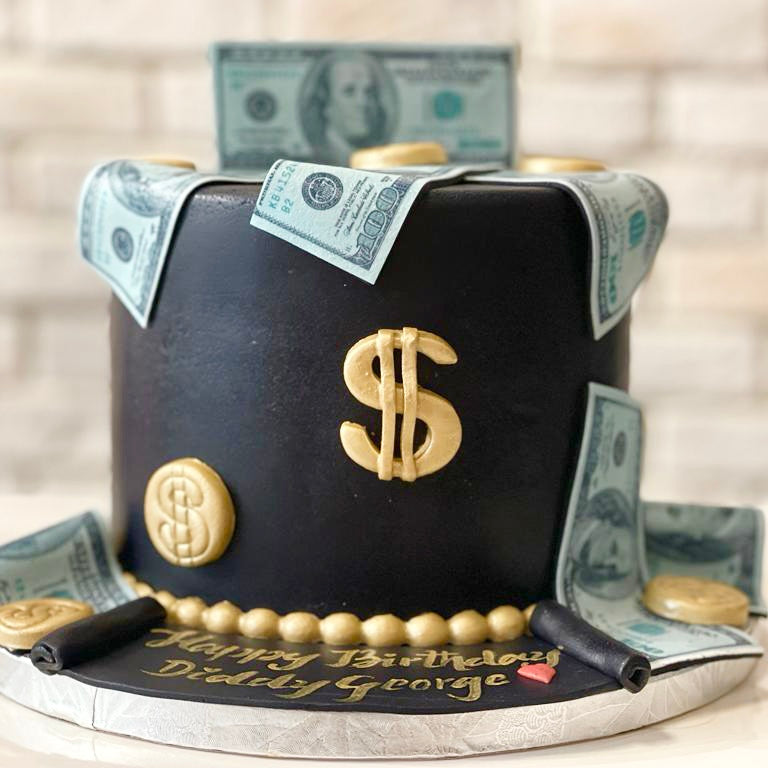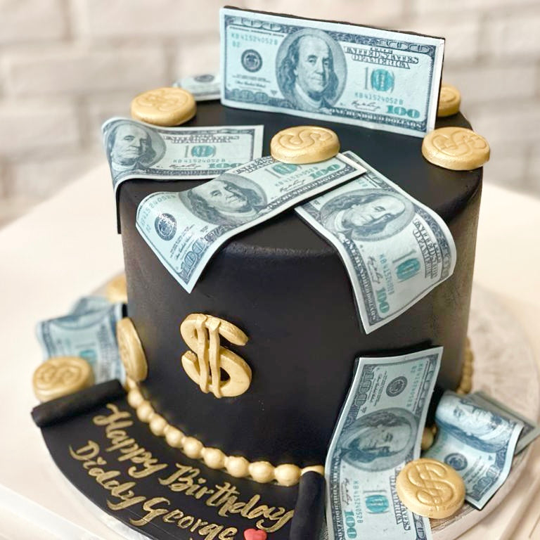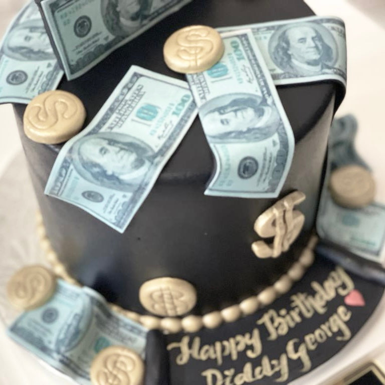 An Elegant black cake topped with dollar bills & coins! Perfect gift for him, your husband, boyfriend, father, friend or any recpient! Perfect for Birthday, Anniversary or any special occasion!