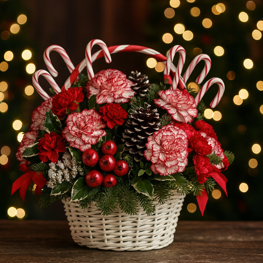 Bring Christmas Joy to friends, family and loved ones with an incredible arrangement, featuring a basket full of white & red carnations, adorned with pinecones, holly and candy canes.
