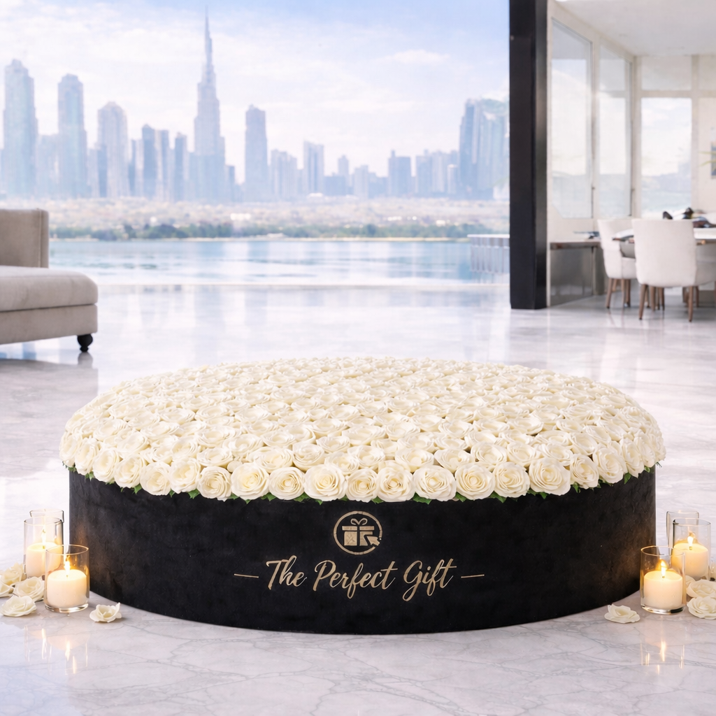 Sweep her off her feet with this luxury velvet extra large round gift box! This gift box holds 500 premium white roses!