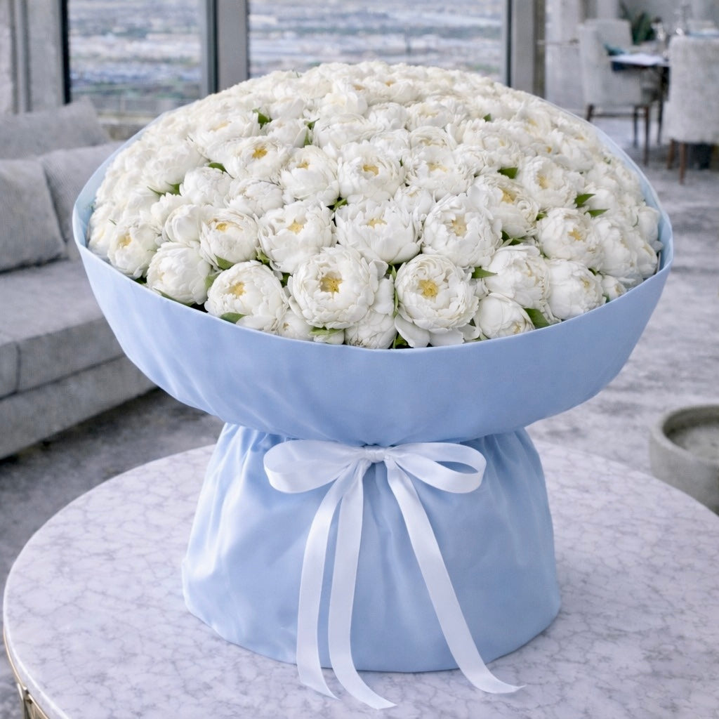 Surprise them with a gift that's surely will be remembered, a classy simple yet elegant flower bouquet! This stunning arrangement features white peonies in blue wrapping & an elegant bow.