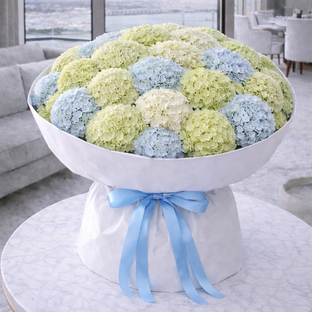 Surprise them with a gift that's surely will be remembered, a classy simple yet elegant flower bouquet! This stunning arrangement features green & blue hydrangea in white wrapping & an elegant bow.