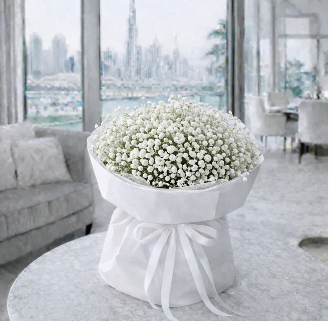 Surprise them with a gift that's surely will be remembered, a classy simple yet elegant flower bouquet! This stunning arrangement features Gypsophila in white wrapping & an elegant bow.