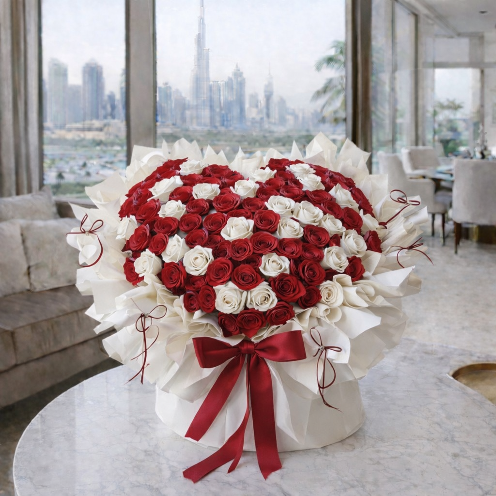 Surprise them with a gift that's surely will be remembered, a classy simple yet elegant flower bouquet! This stunning arrangement features 100 red & white roses in heart shape wrapping & an elegant bow.