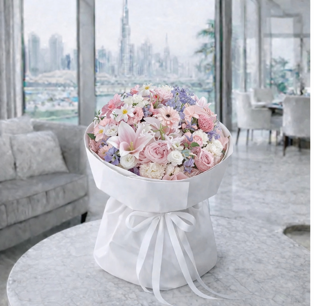 Shop our pink flower bouquet Gifts online with delivery to Dubai! Same day delivery also available. Enjoy our signature gift card with your order!