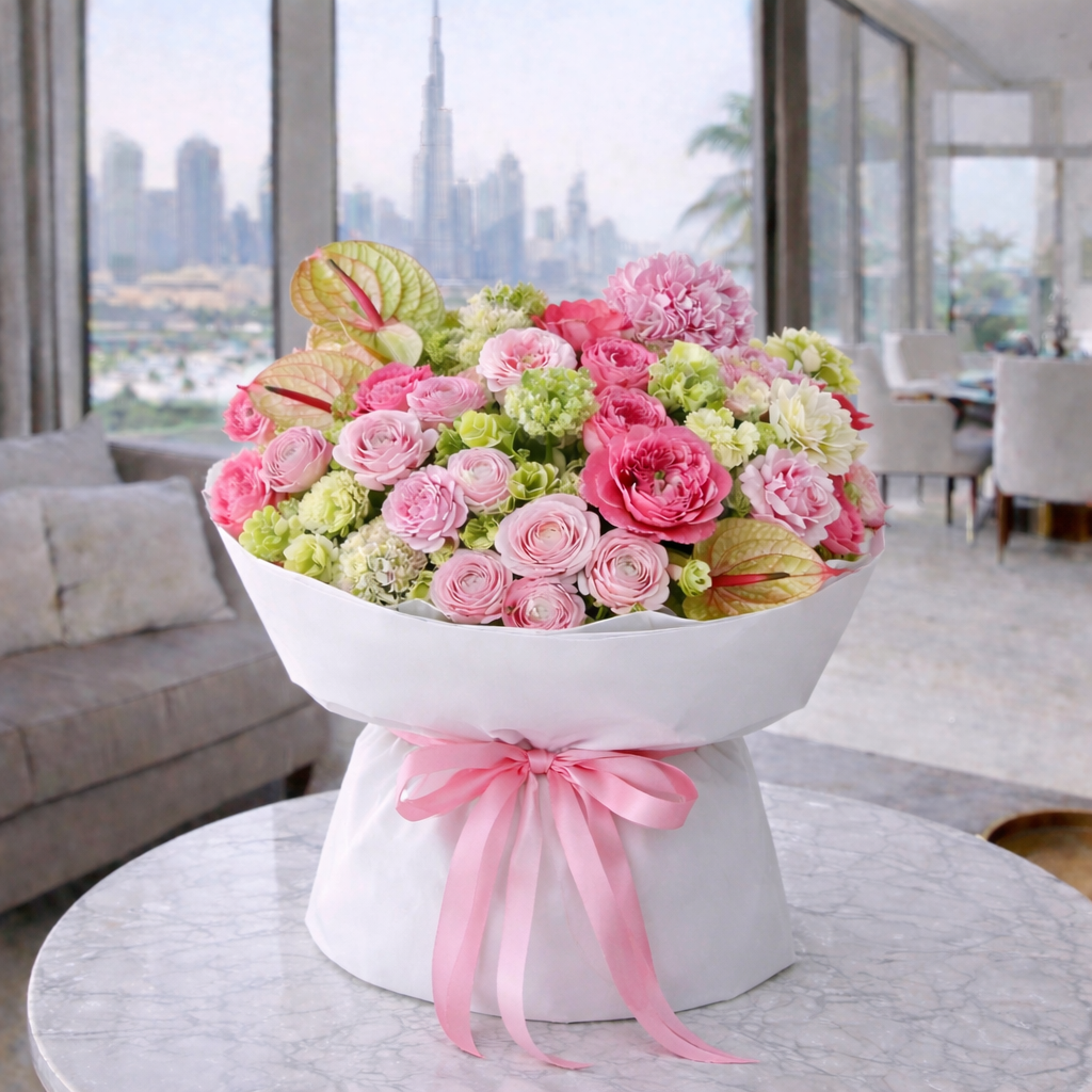 Shop our pink flower bouquet Gifts online with delivery to Dubai! Same day delivery also available. Enjoy our signature gift card with your order!