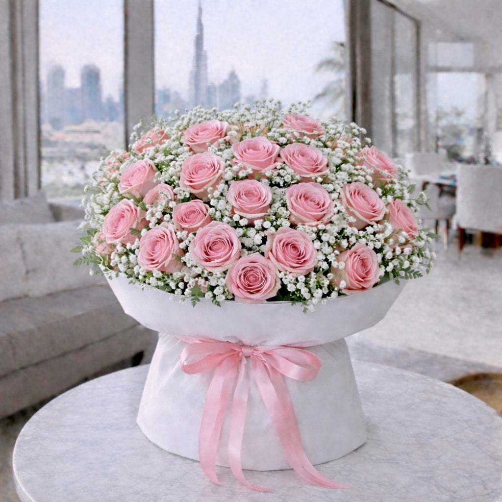 Surprise them with a gift that's surely will be remembered, a classy simple yet elegant flower bouquet! This stunning arrangement features pink roses with gypso wrapped in white wrapping & an elegant matching bow.