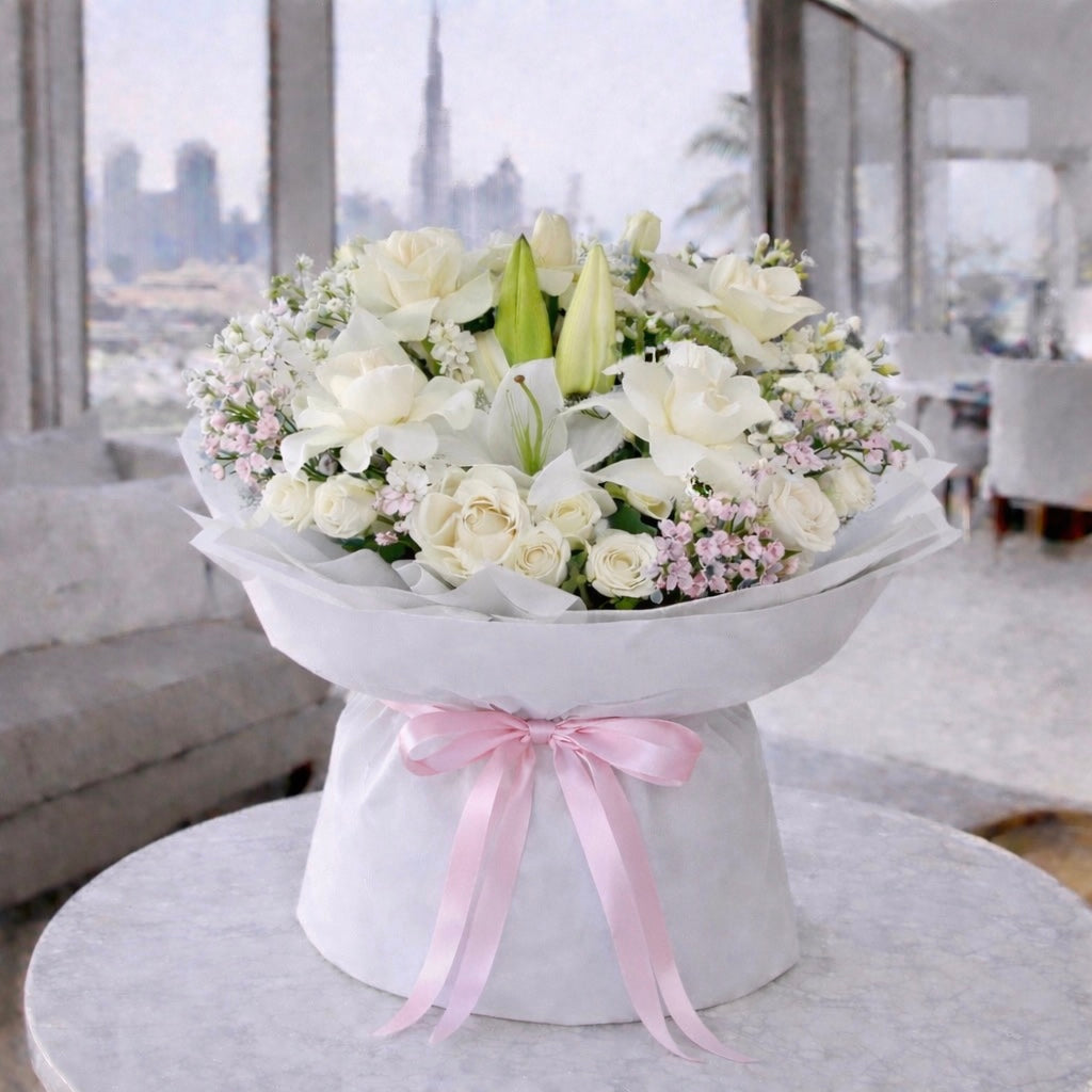 Surprise them with a gift that's surely will be remembered, a classy simple yet elegant flower bouquet! This stunning arrangement features white & pink mix of roses ,spray roses, lilies & gypso wrapped in white wrapping & an elegant matching bow