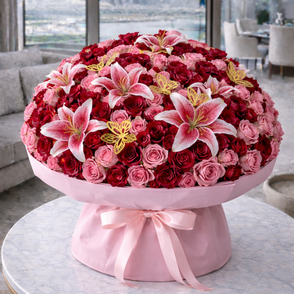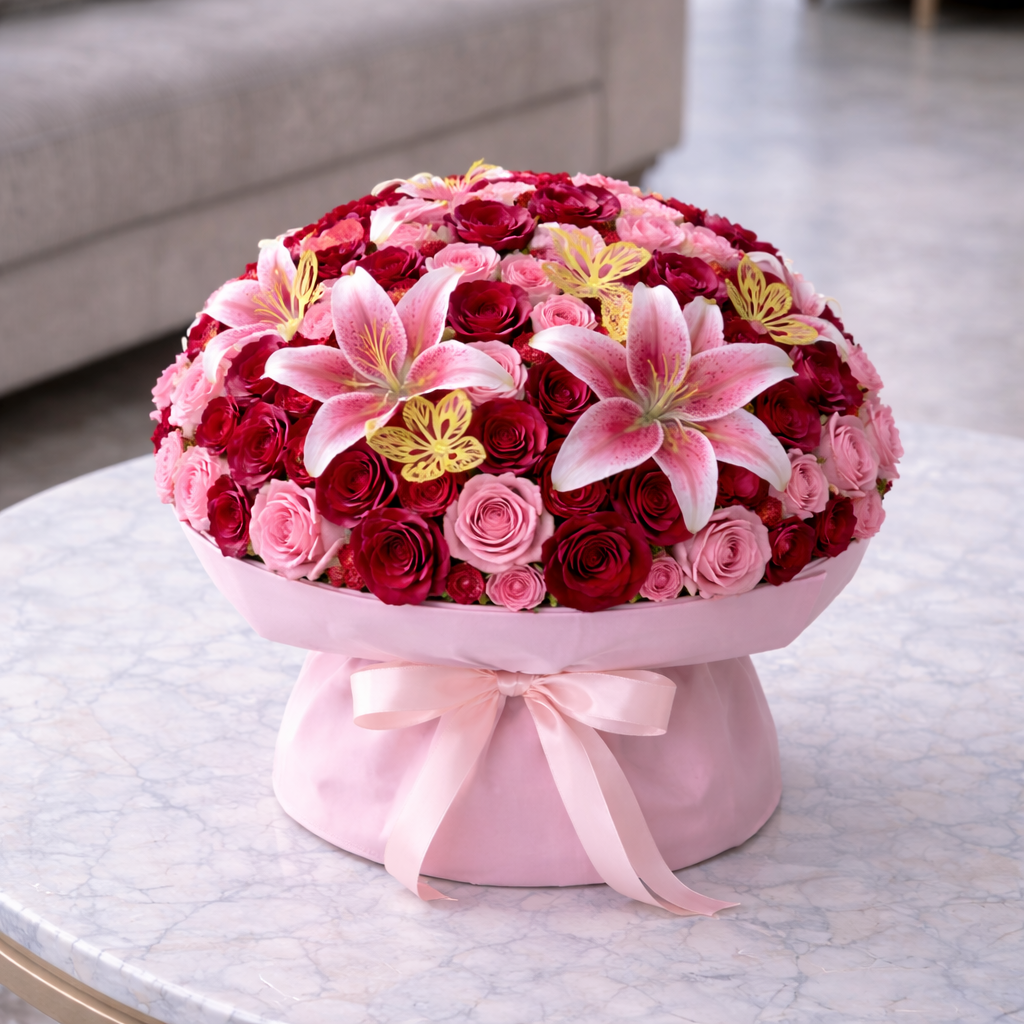 Surprise them with a gift that's surely will be remembered, a classy simple yet elegant flower bouquet! This stunning arrangement features pink & red roses with lilies & gold butterflies in pink wrapping & an elegant bow.