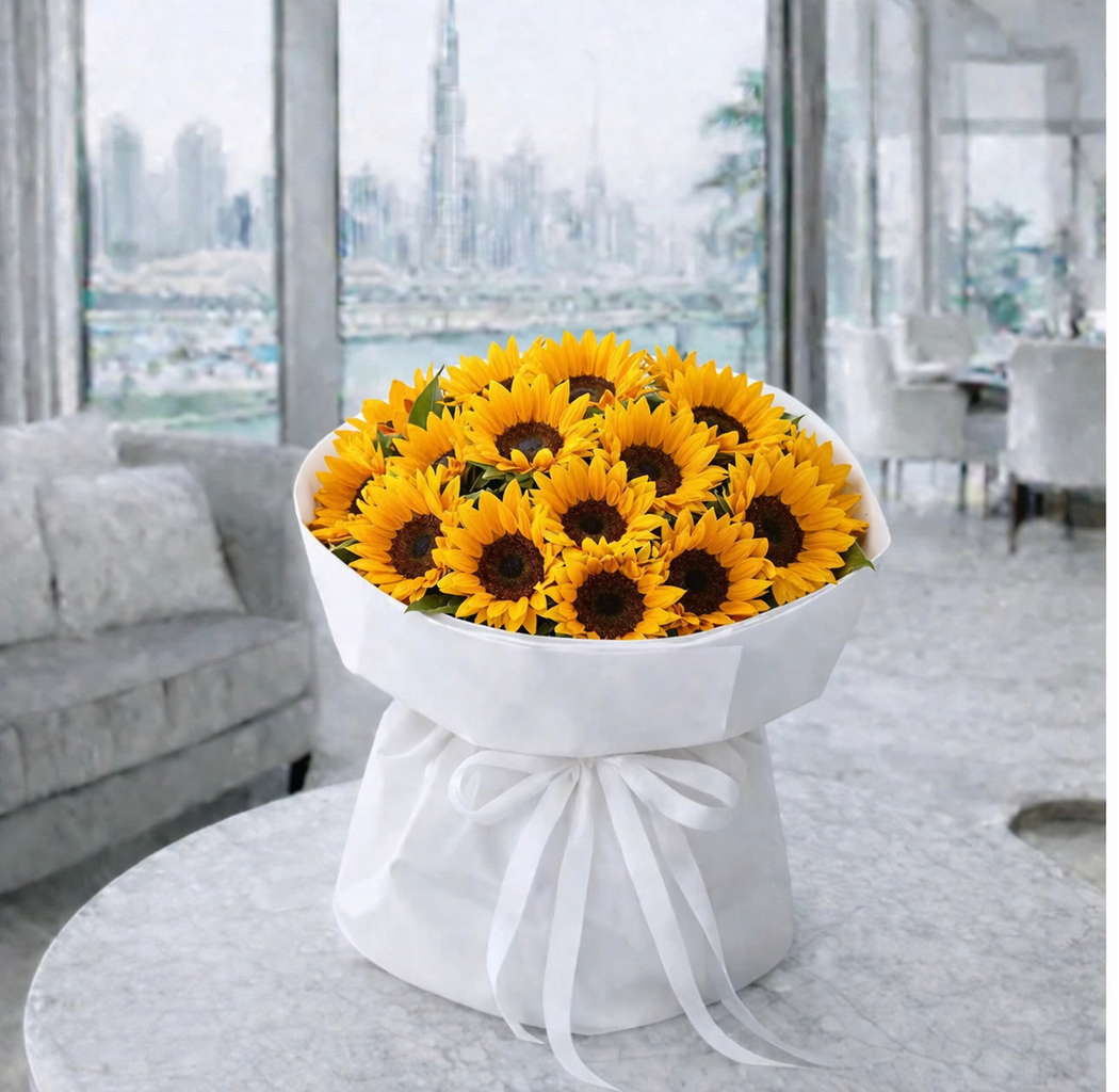 Surprise them with a gift that's surely will be remembered, a classy simple yet elegant flower bouquet! This stunning arrangement features sunflower in white wrapping & an elegant bow.