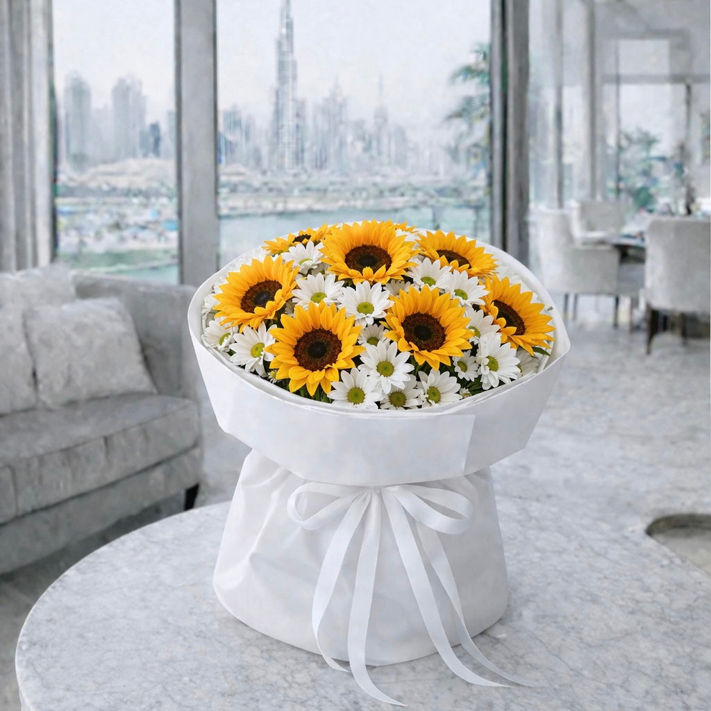 Surprise them with a gift that's surely will be remembered, a classy simple yet elegant flower bouquet! This stunning arrangement features sunflower & daisies in white wrapping & an elegant bow.