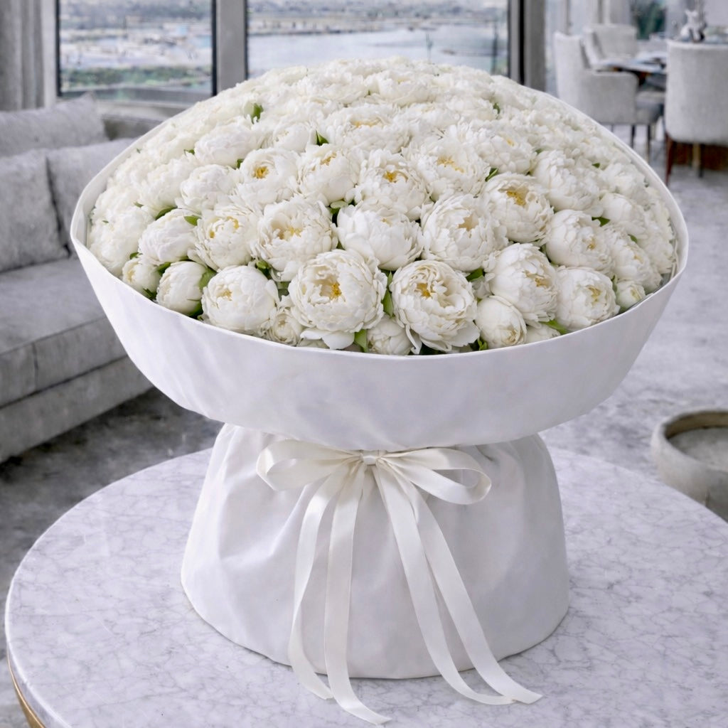 Surprise them with a gift that's surely will be remembered, a classy simple yet elegant flower bouquet! This stunning arrangement features white peonies in white wrapping & an elegant bow.