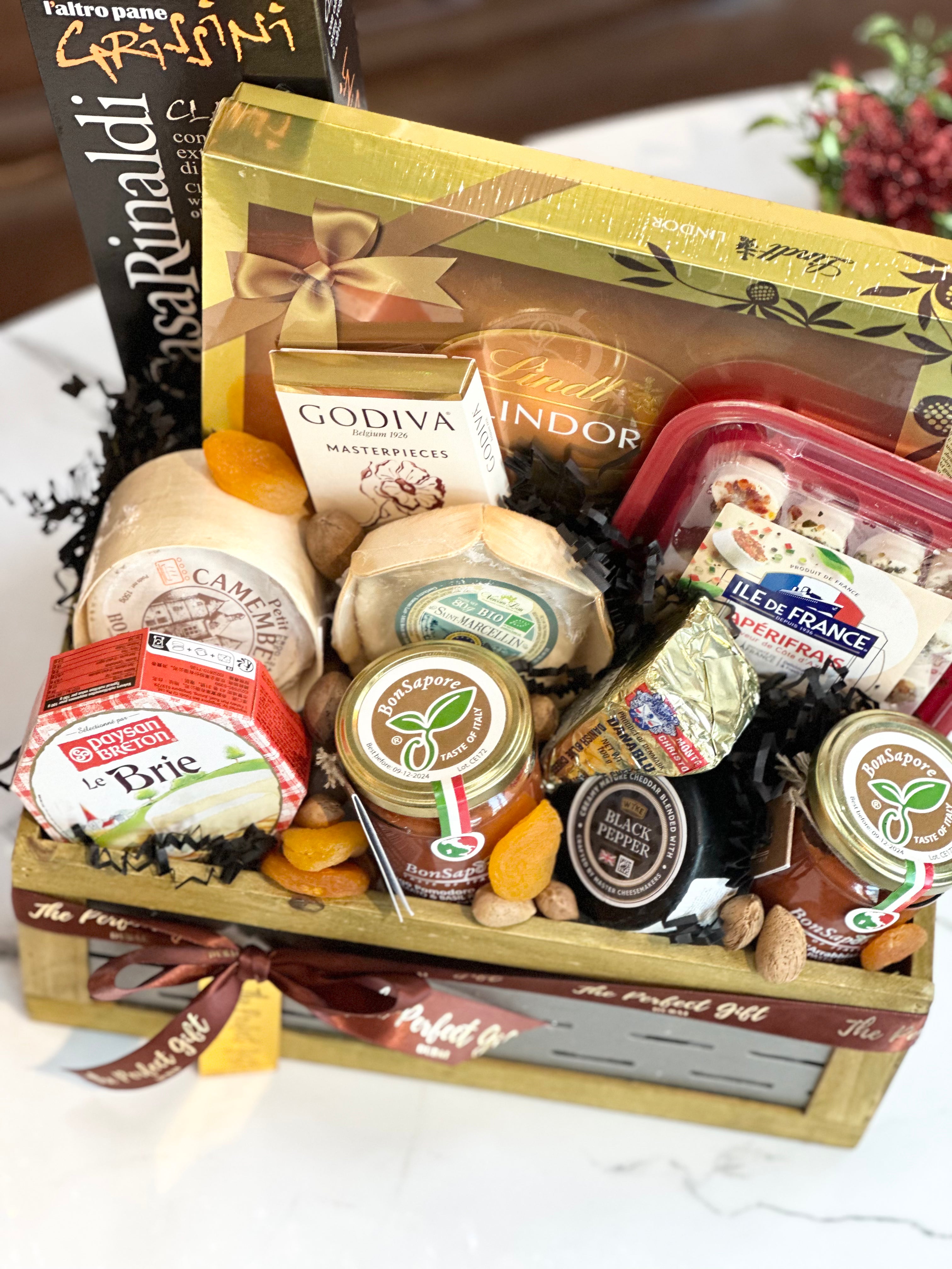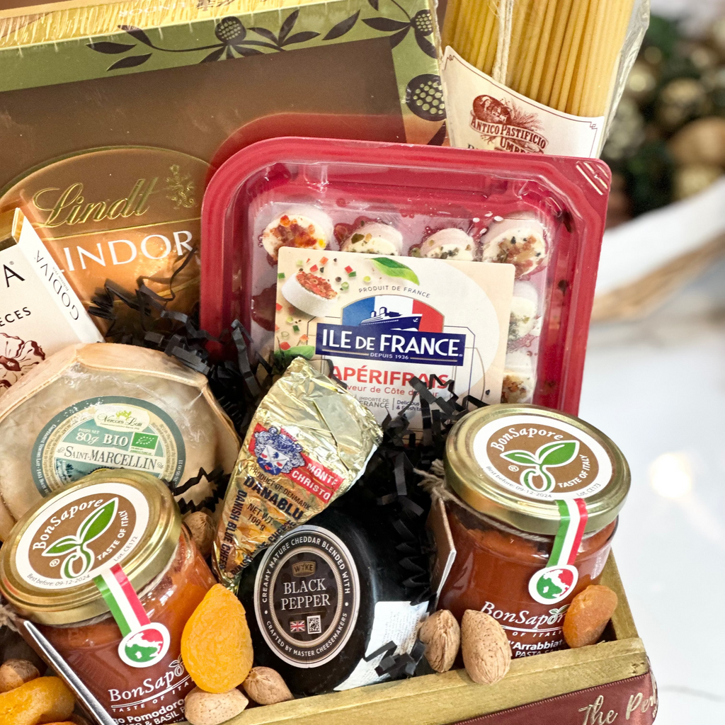 Surprise them on their special occasion with this cheese & pasta gift hamper featuring a wooden box filled with an assortment of delectable, savory and HALAL cheese treats perfect for any occasion including Ramadan, Christmas!