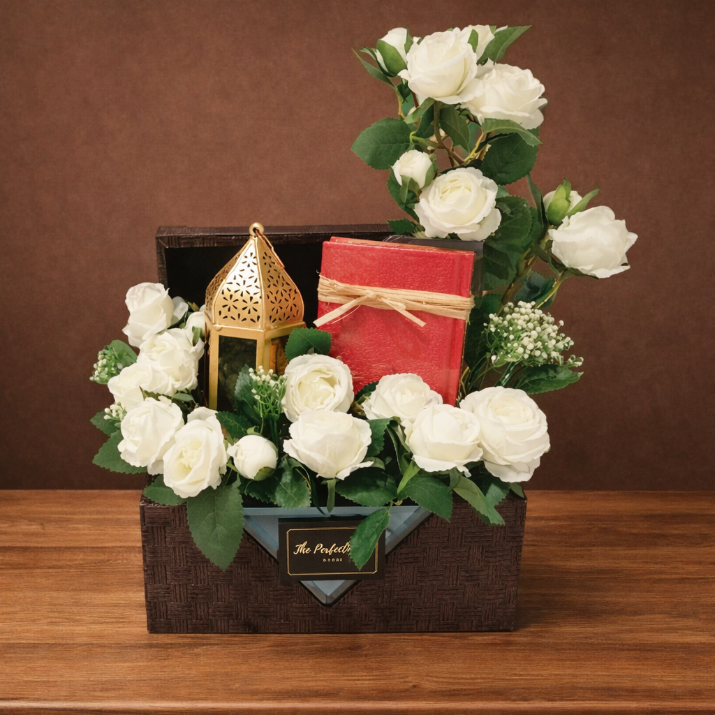 Surprise loved ones, colleagues or clients this Holy Month with our Holy Quran Gift & roses arrangement! Presented in an elegant gift metal and include and a lantern!