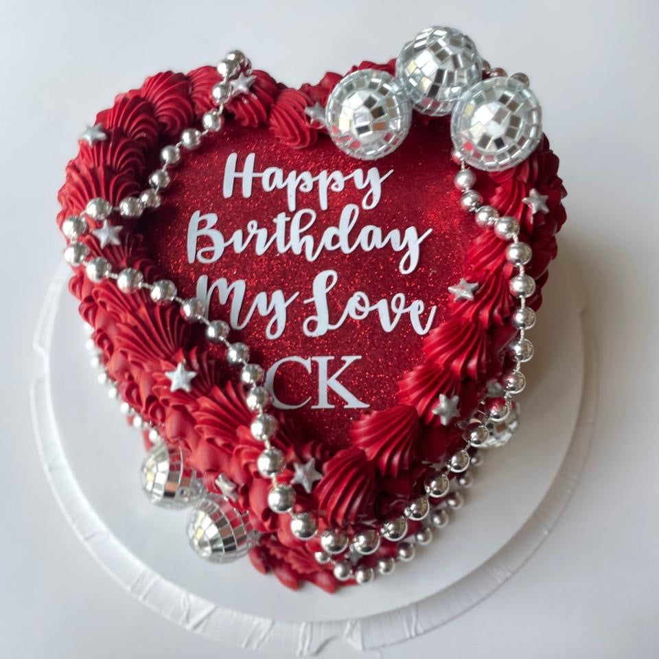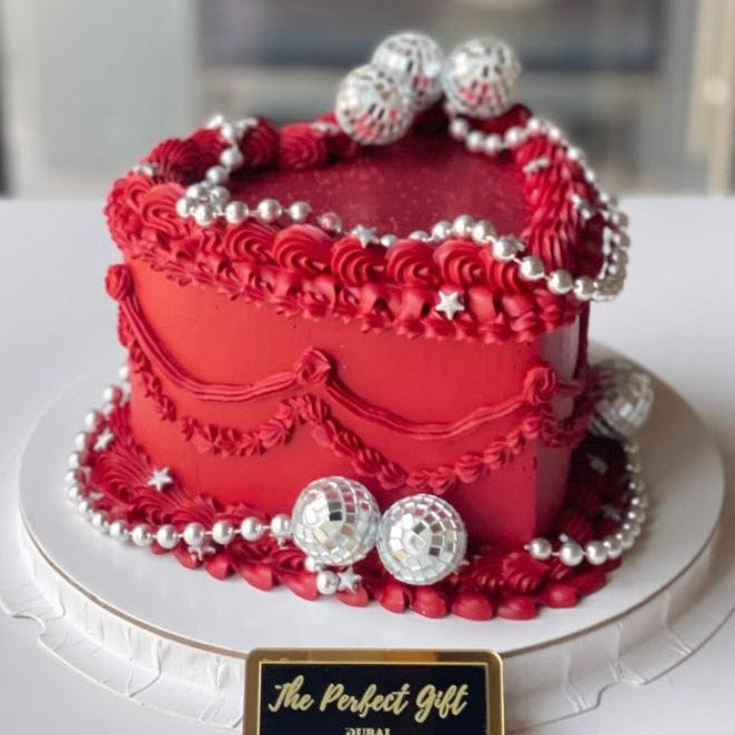 Send your best wishes with this trendy Heart Cake! This gorgeous creation is composed of sponge cake in the shape of a red, in black with elegant piping design on top of the cake and finally decorated with edible glitter sparkling & shining the cake.