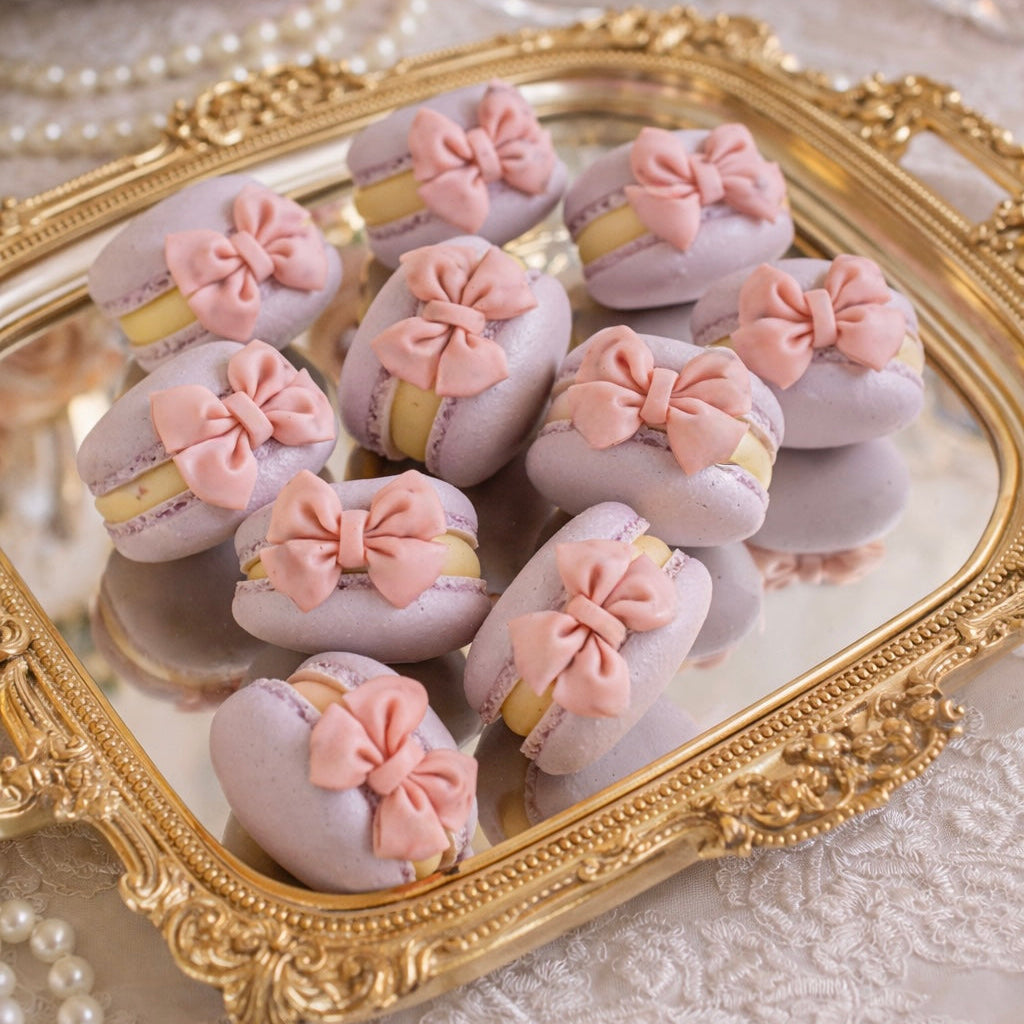 Brighten their day with these sweet treats! These pastel purple color macarons with pink bows, Filling flavor in either chocolate or vanilla Perfect for party table setup and gifting loved ones on their birthday, or special occasion.