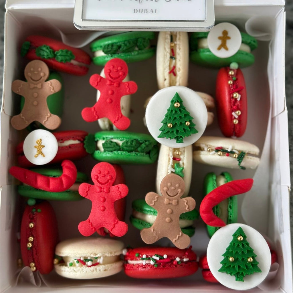 Includes 16 macarons with gingerbread man, candy canes, christmas trees & festive colors sprinkles!