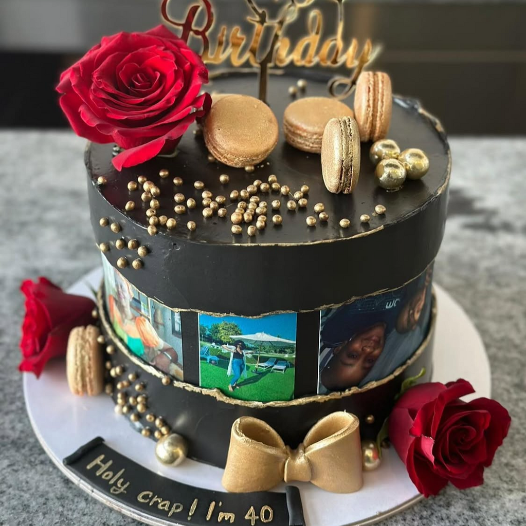 Send your best wishes with this trendy Black, gold & red Cake!  This elegant creation is composed of sponge cake decorated with photos on the sides, and roses, macarons  & pearl beads. Made with swiss chocolate and finest ingredients, this cake is light yet full of flavor making you crave another piece!