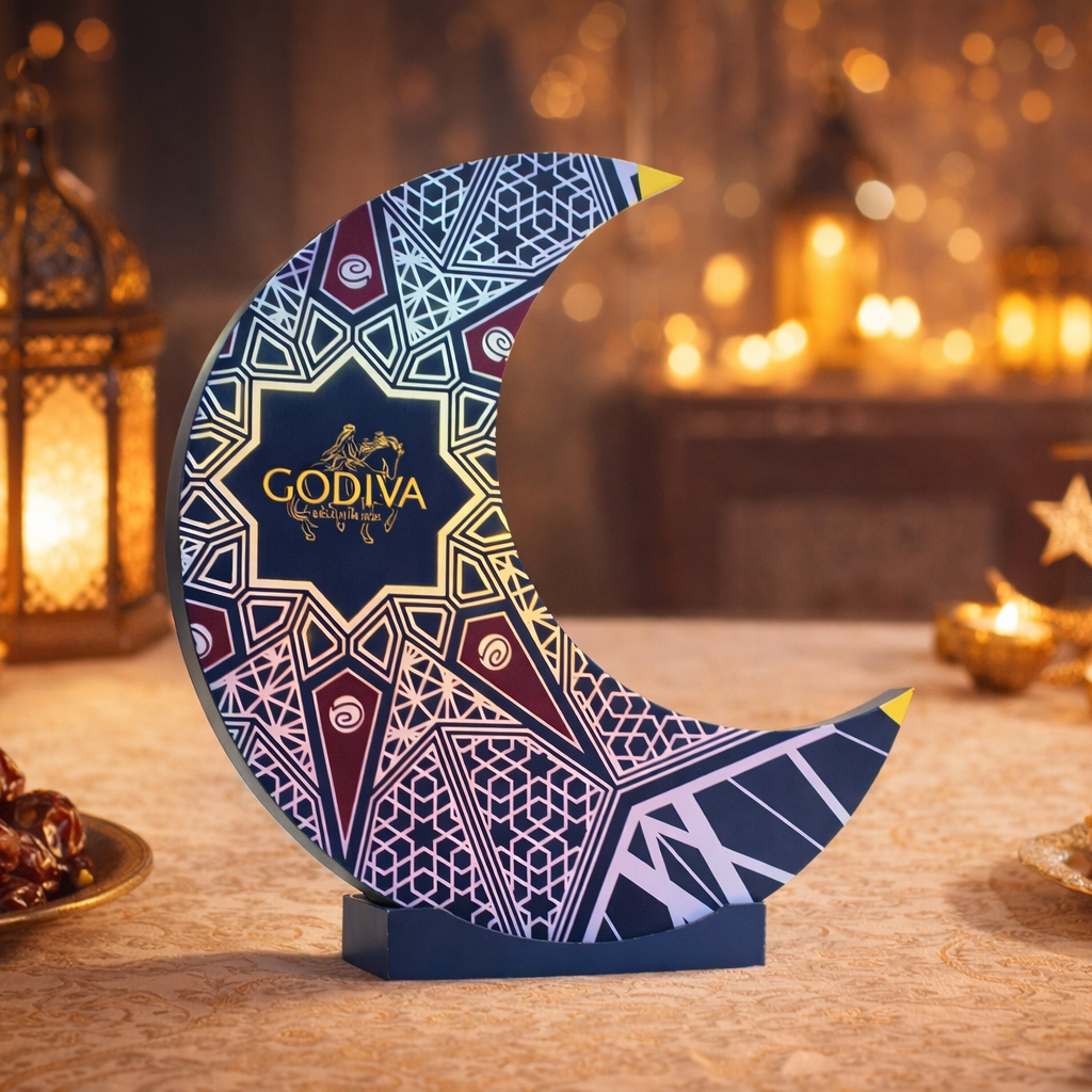 Surprise them this Holy month of Ramadan with Godiva's limited edition Crescent shape box, containing 24 pcs of assorted chocolate. Box size approx 40 cm.