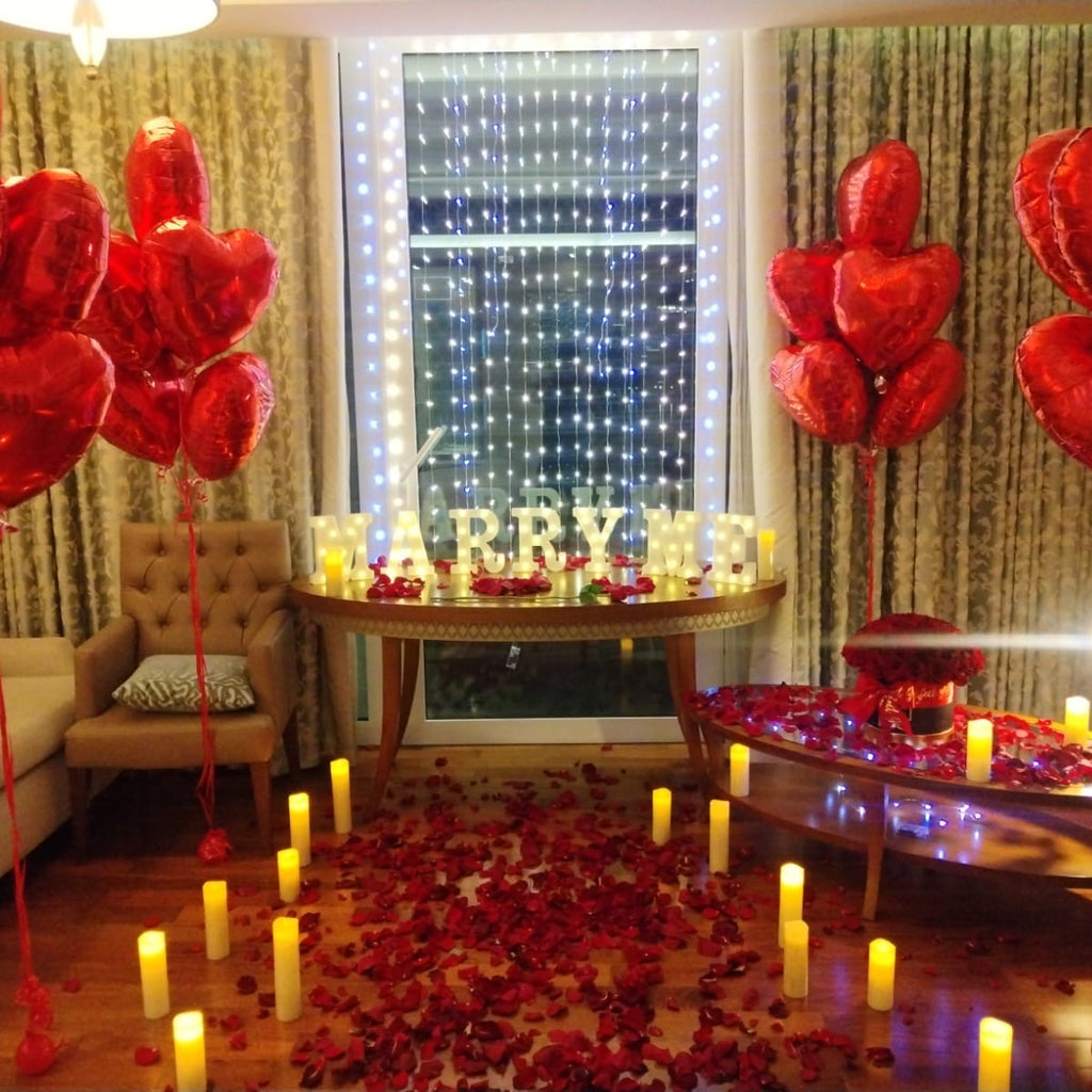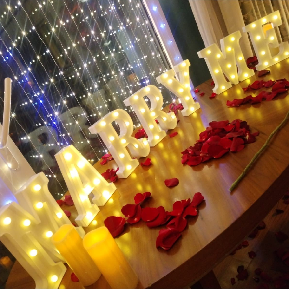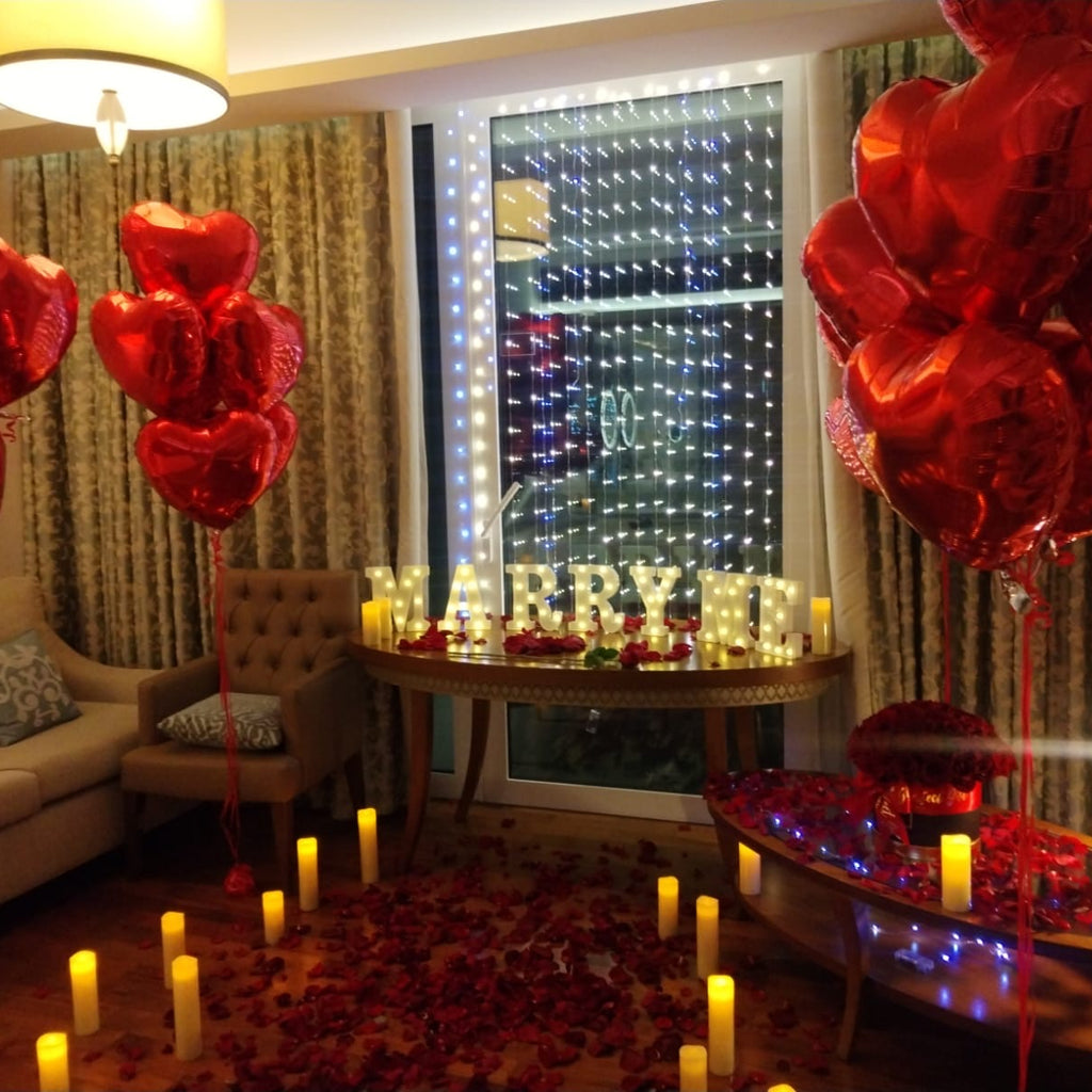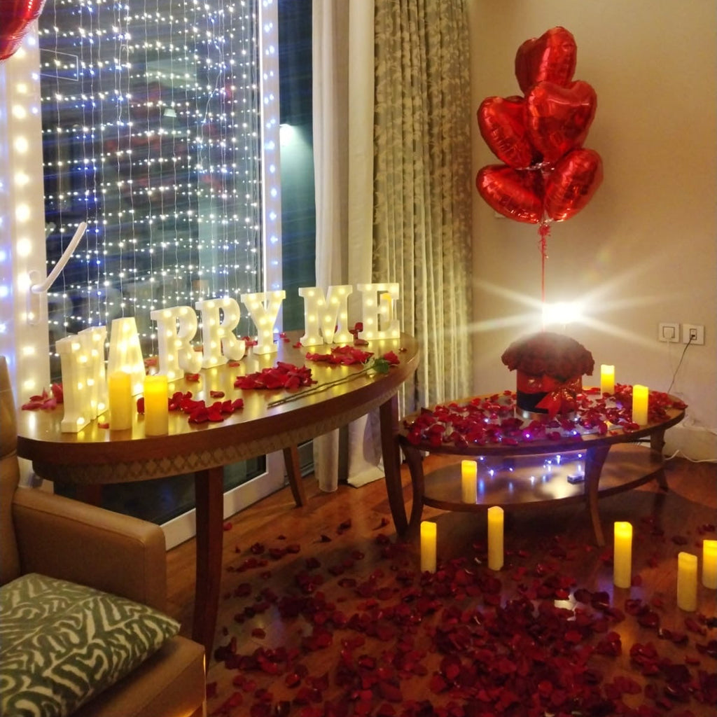 Propose to her and Create a magical surprise with this MARRY ME petals & light letters decor making this day an unforgettable day to remember! Perfect for hotel bedrooms, home decoration or any venue.