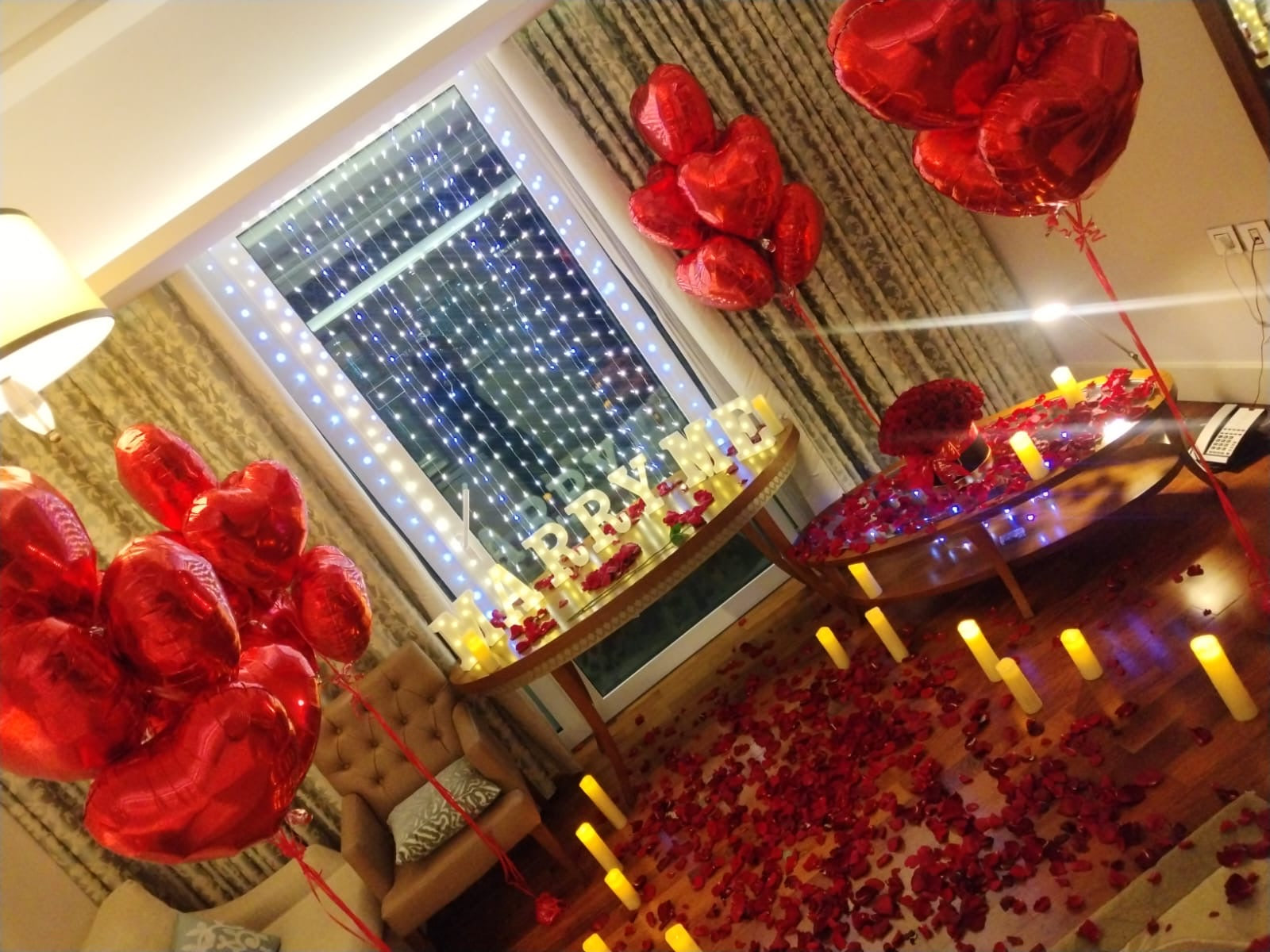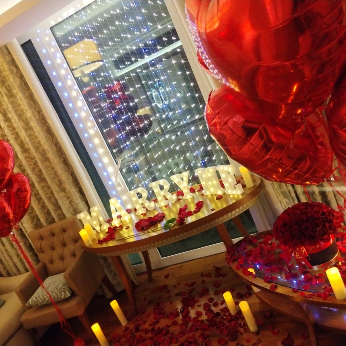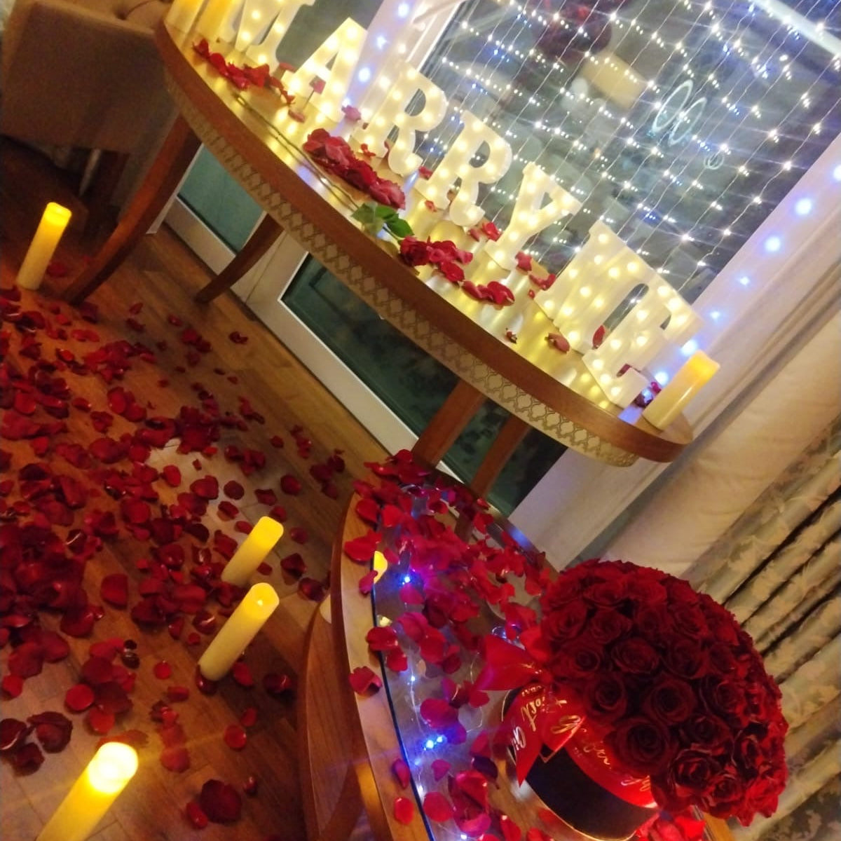 Propose to her and Create a magical surprise with this MARRY ME petals & light letters decor making this day an unforgettable day to remember! Perfect for hotel bedrooms, home decoration or any venue.