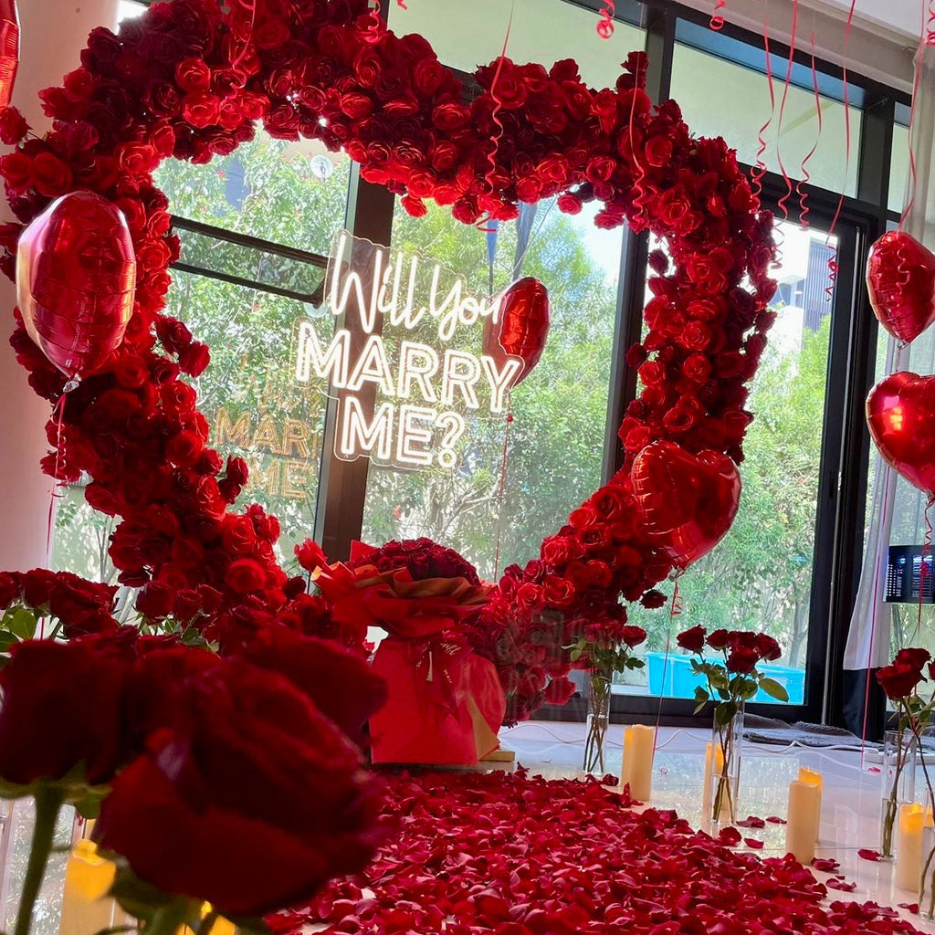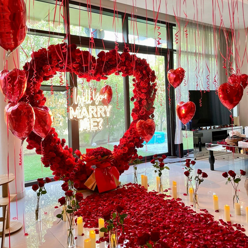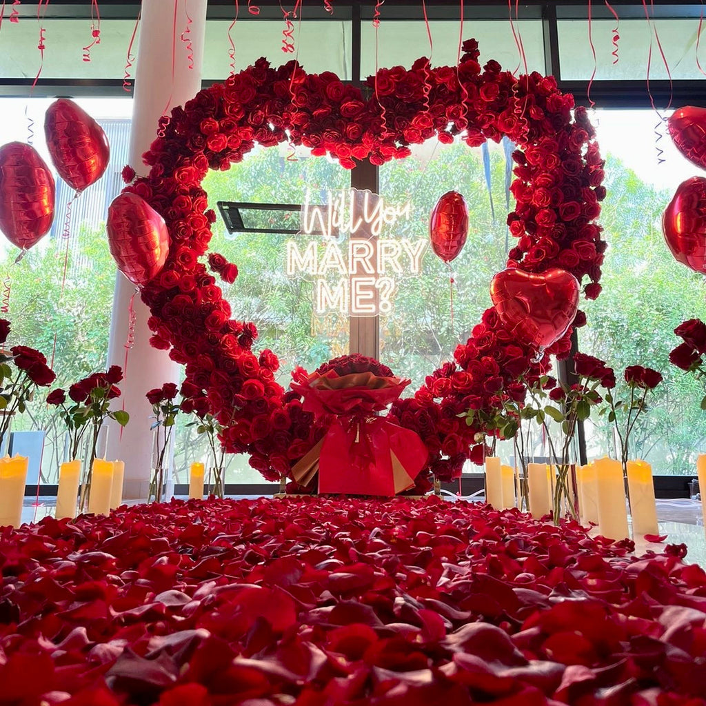 Propose to her and Create a magical surprise with this romantic WILL YOU MARRY ME proposal red roses heart arch, petals and candles!