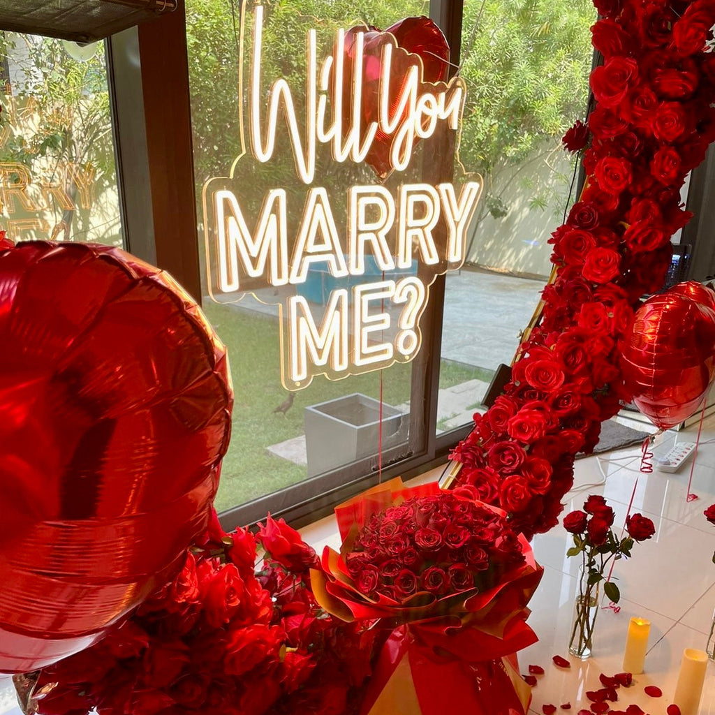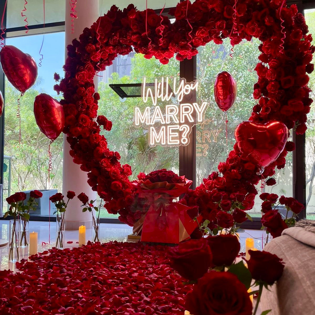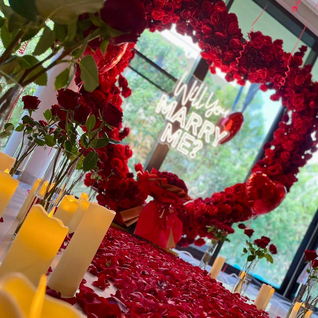Propose to her and Create a magical surprise with this romantic WILL YOU MARRY ME proposal red roses heart arch, petals and candles!