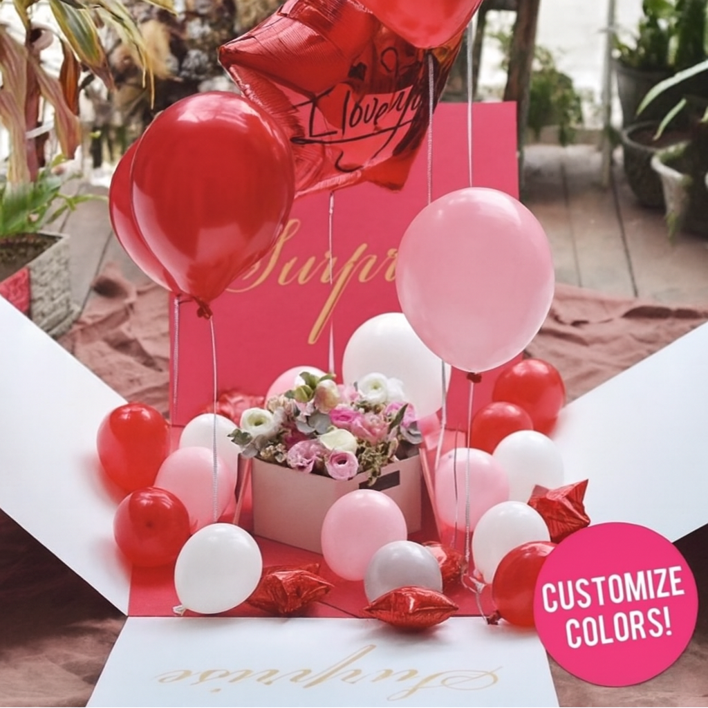 Give your loved one a magical gift experience they won't forget! Surprise them with this wonderful gift box, that opens to a flower arrangement that's been carefully put together with celebratory balloons that float when the box is opened.