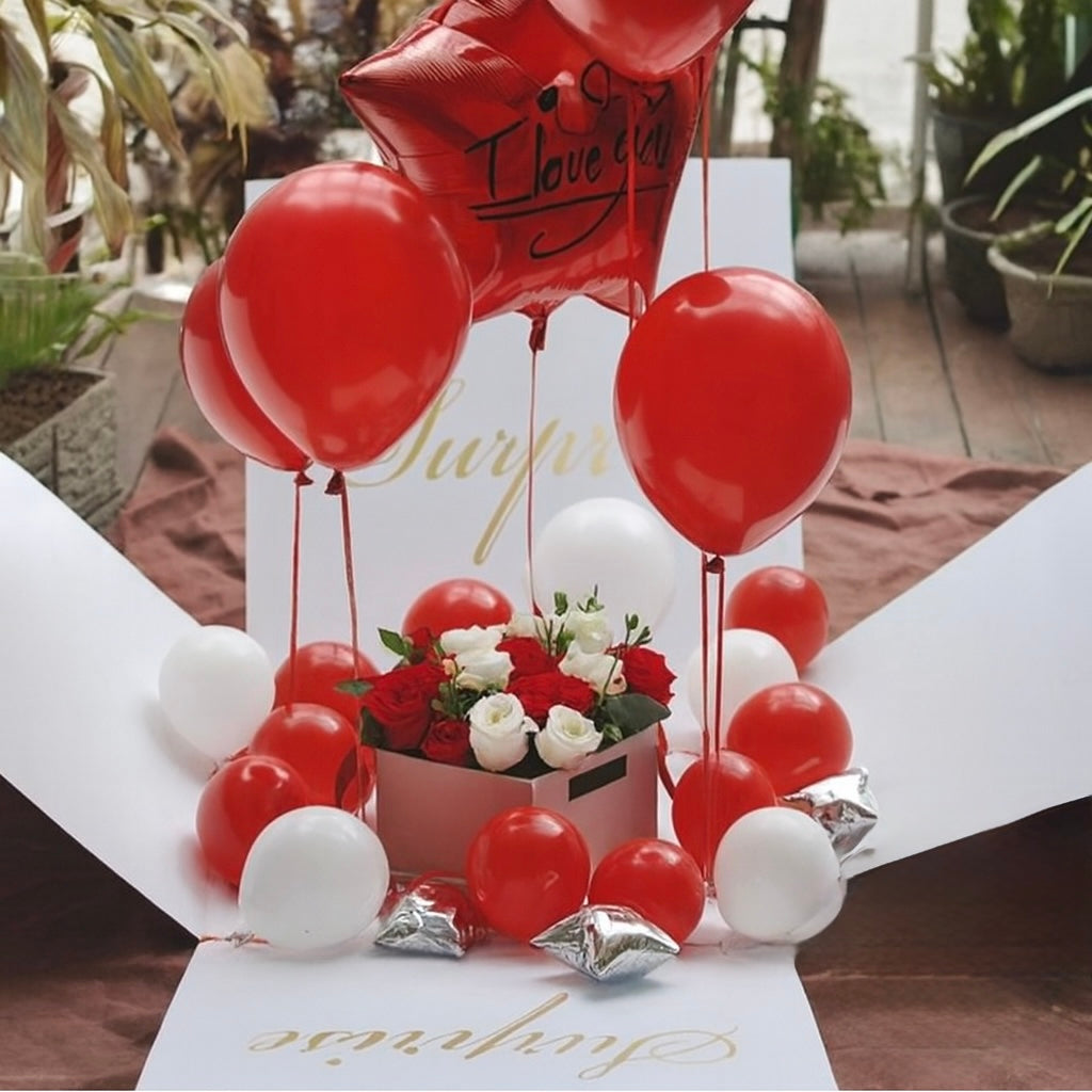 Red & White Balloon Box with Flowers