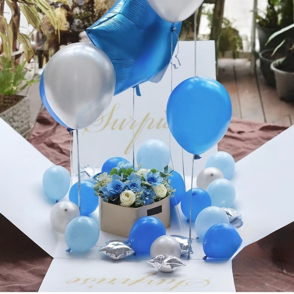 Give your loved one a magical gift experience they won't forget! Surprise them with this wonderful gift box, that opens to a flower arrangement that's been carefully put together with celebratory balloons that float when the box is opened.