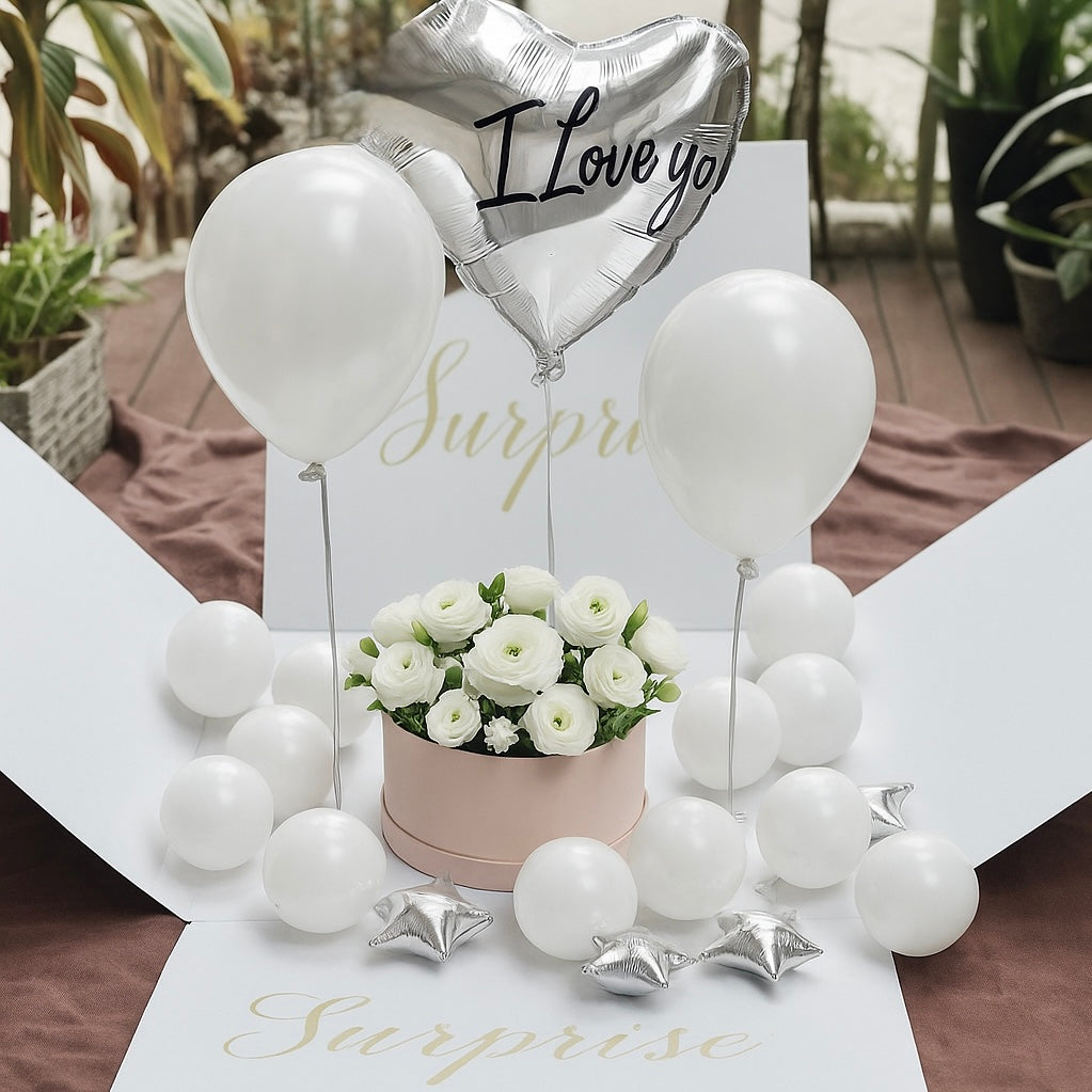 Give your loved one a magical gift experience they won't forget! Surprise them with this wonderful gift box, that opens to a flower arrangement that's been carefully put together with celebratory balloons that float when the box is opened.